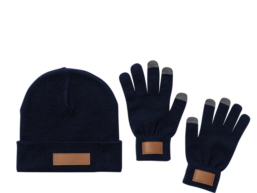 Akrylová pletená zimní čepice a rukavice na dotykovou obrazovku s potisknutelnými nášivkami z PU kůže, v jedné velikosti pro dospělé.