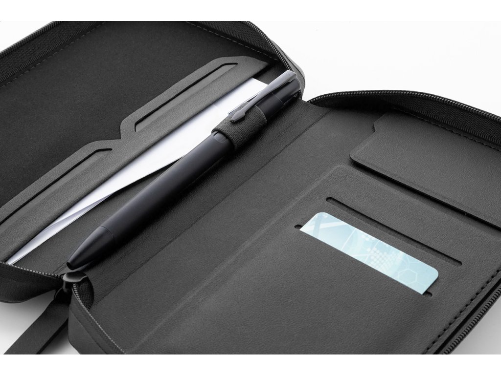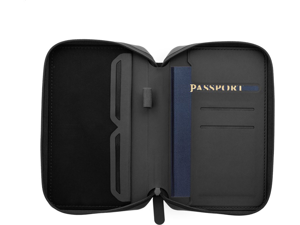 Luxusní cestovní organizér a pouzdro na pas na zip z recyklované umělé kůže. S několika vnitřními kapsami na dokumenty, karty a cestovní nezbytnosti.