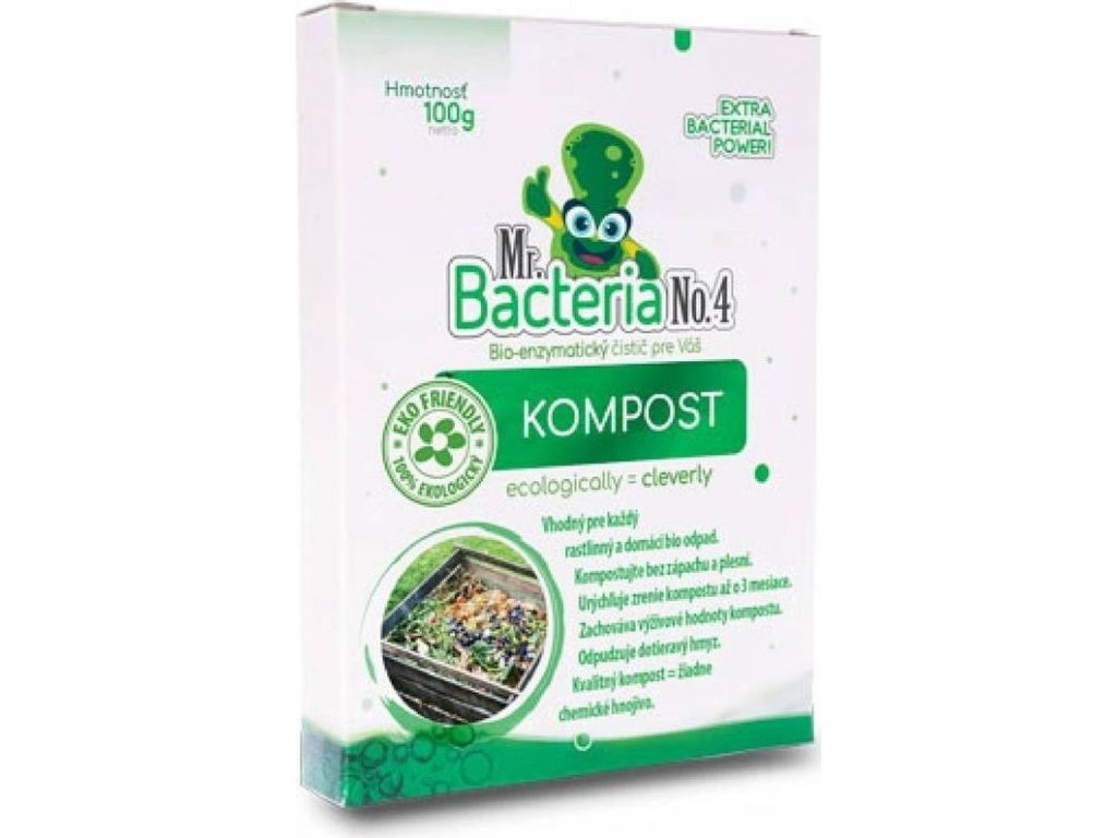 Zcela přírodní a ekologický bio-aktivní přípravek Mr. Bacteria No. 4 urychlovač kompostu je určen k urychlení kompostování. Obvyklá délka kompostování je v rozsahu jednoho roku. Přípravek Mr. Bacteria No. 4 umí značně urychlit proces kompostování zahradního odpadu a vybraného biologického odpadu z Vaší domácnosti. Mr. Bacteria No. 4 je směs bakteriálních kultur smíchaných s nezpracovanými enzymy, emulgátory a živinami, speciálně navržená pro kompostování organických odpadů (odpad po sezónním prořezávání okrasných keřů - štěpka, kůra, piliny, tráva, listí, ovoce, zelenina, květiny, bioodpad z domácností a pod. Výrobek funguje ve dvou fázích: urychlení nastartování a výrazné zkrácení celého procesu kompostování. Použitím přípravku Mr. Bacteria No. 4 dochází k maximalizaci hnojiv hodnot kompostu. Výsledkem použití přípravku Mr. Bacteria No. 4. je zkrácení délky kompostování.