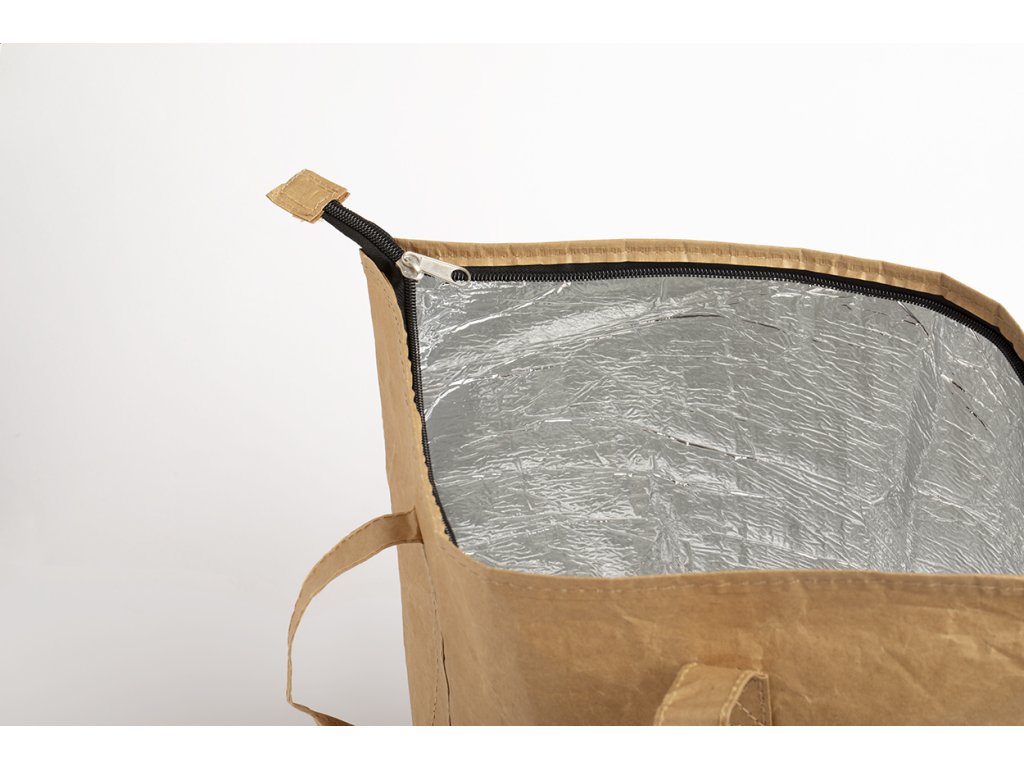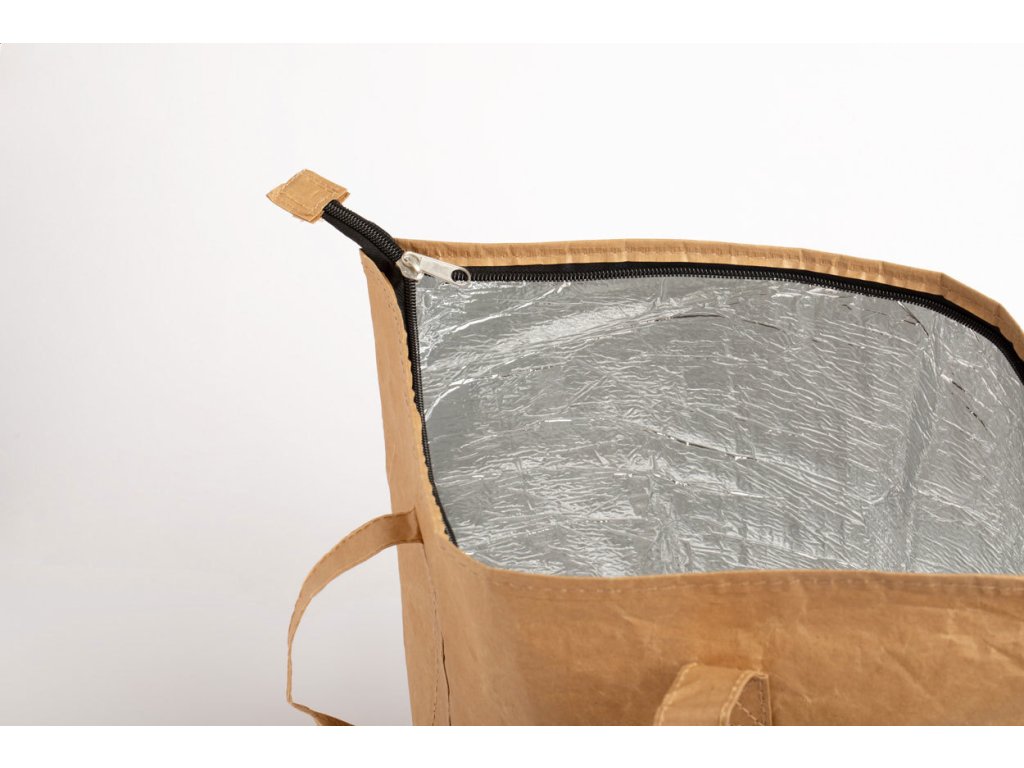 Polaminovaná chladicí taška z recyklovaného papíru na zip s hliníkovým polstrováním a krátkými uchy.