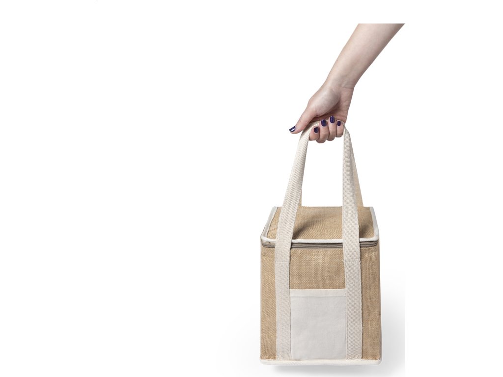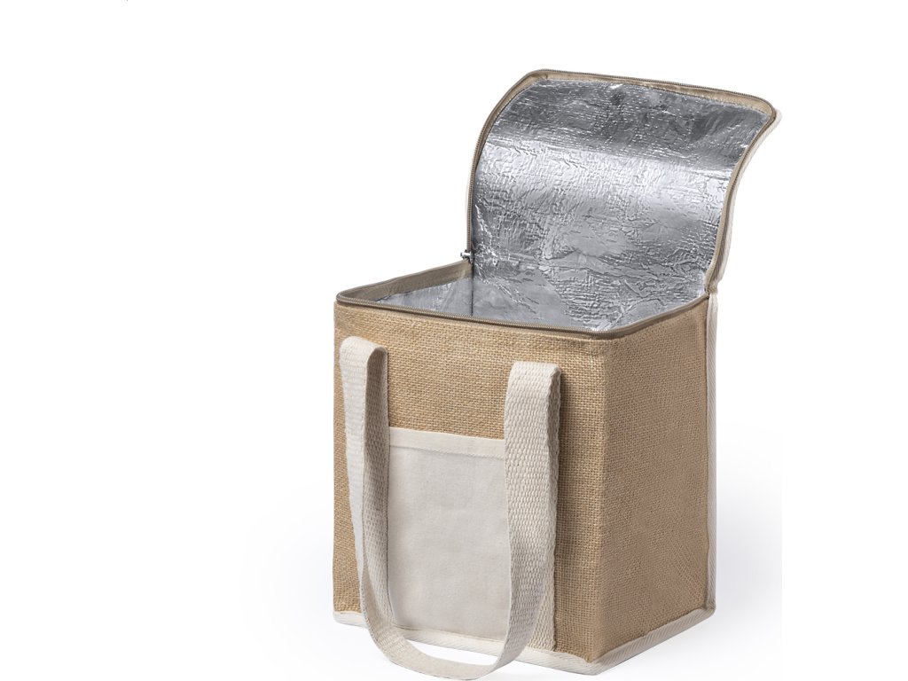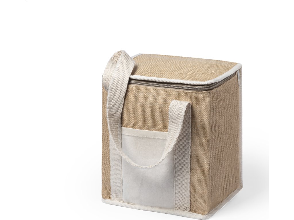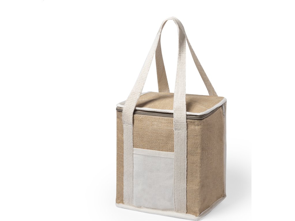 Chladící taška na zip z laminované juty a bavlny s hliníkovou výplní. S přední kapsou z bavlny, ideální pro potisk.