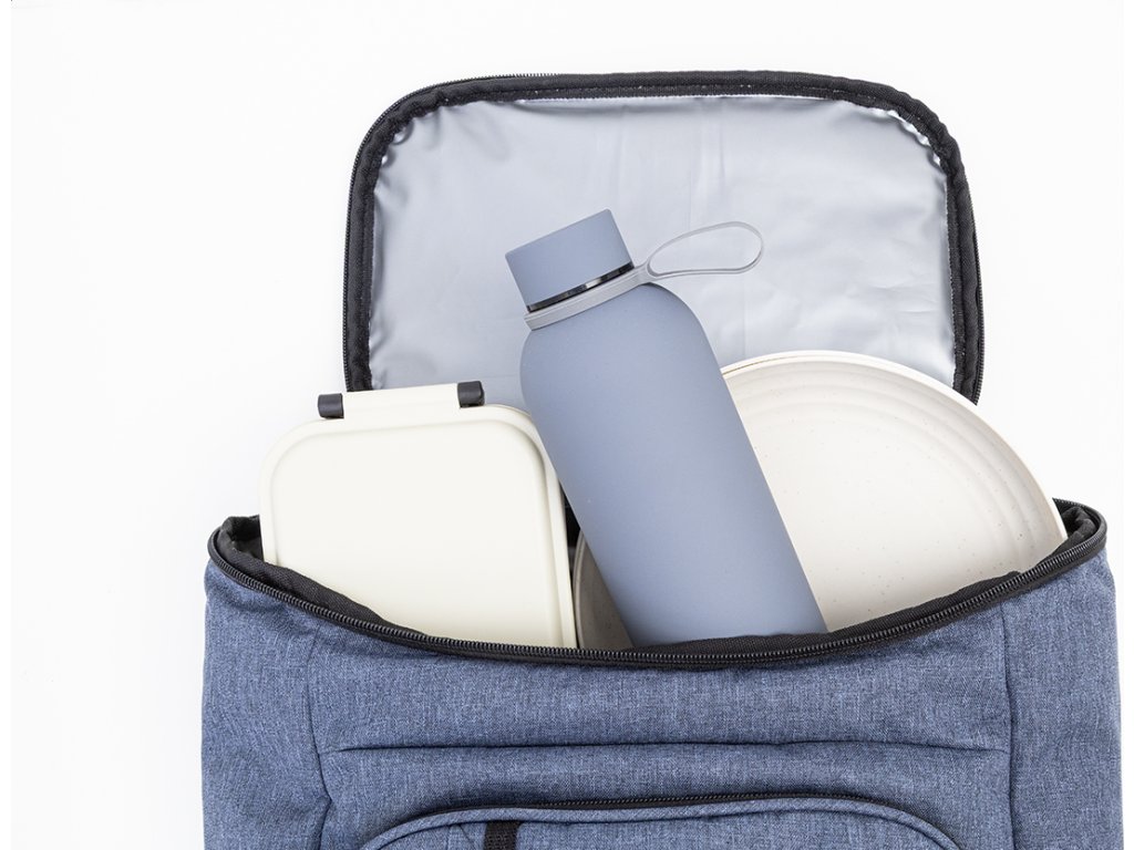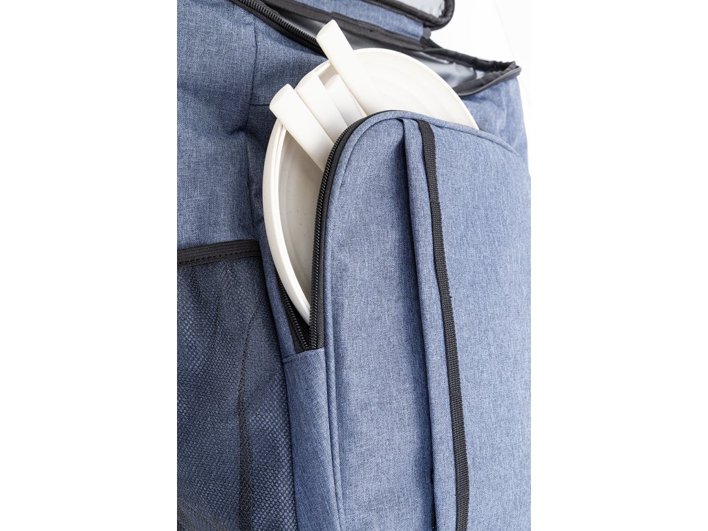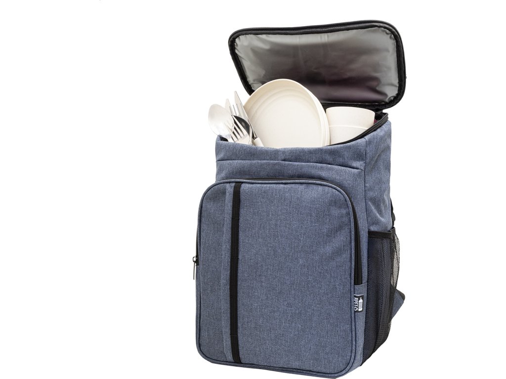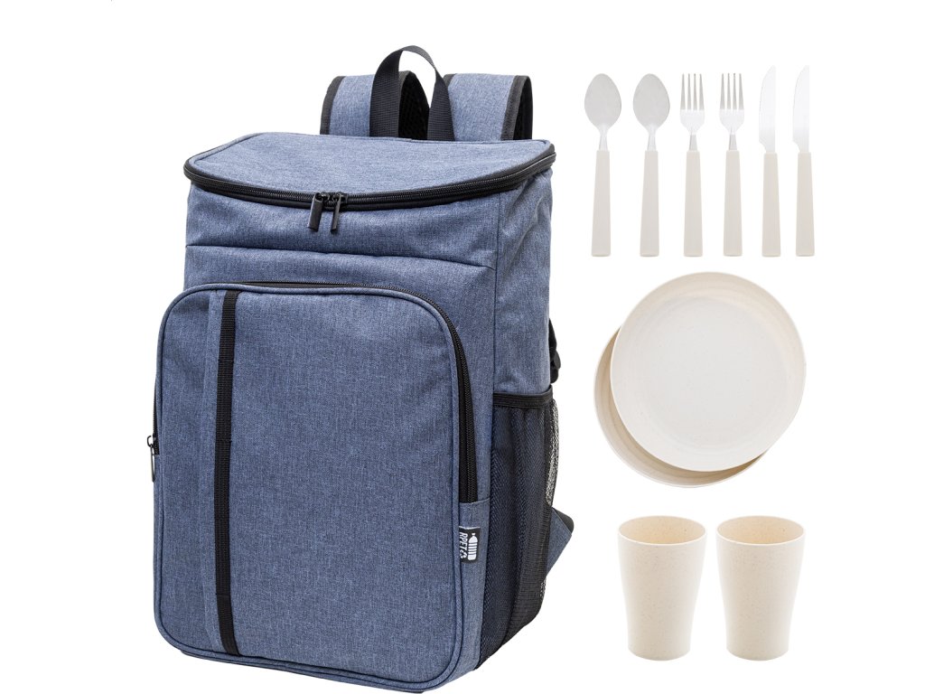 Chladicí piknikový batoh z RPET s přední kapsou na zip a chladicí přihrádkou na zip s PEVA výplní. S bočními síťovanými kapsami, polstrovanými zády a ramenními popruhy. Včetně nádobí z PP a nerezové oceli pro 2 osoby: 2 talíře, 2 hrnky, 2 vidličky, 2 lžíce a 2 nože. 600D RPET polyester s výrazným štítkem RPET.