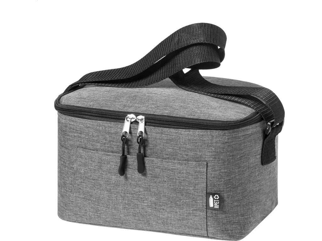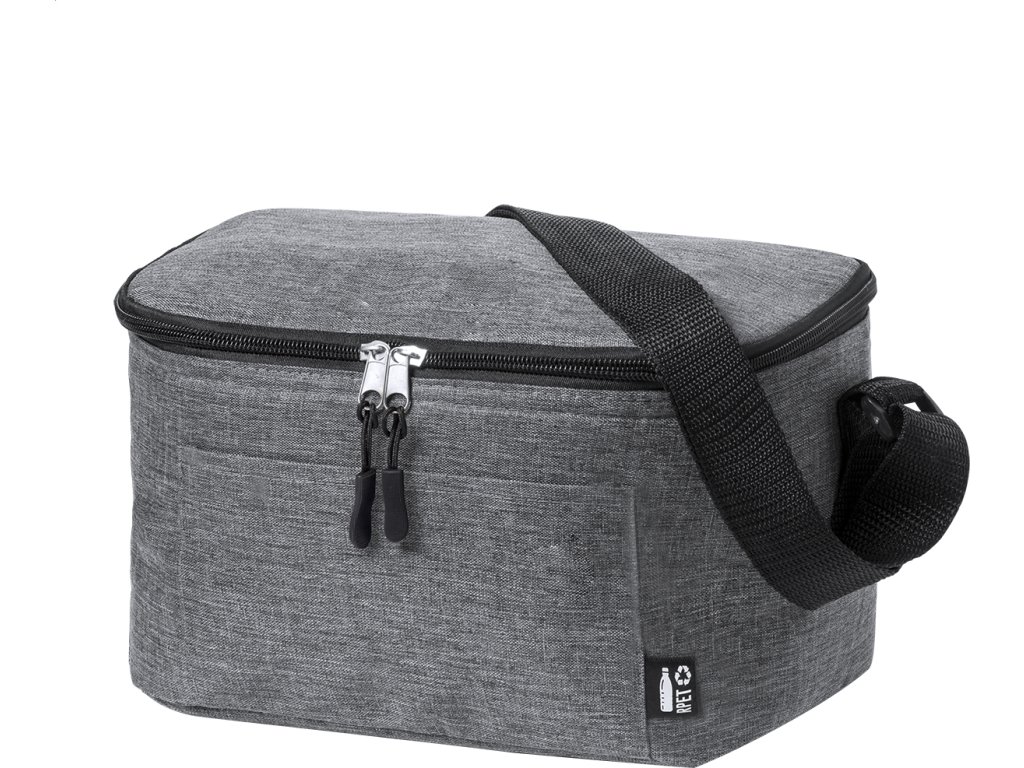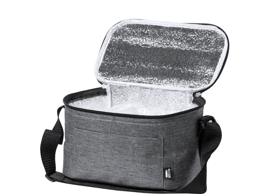 Chladící taška na zip z RPET s hliníkovou vložkou, pro 6 ks 0,33L plechovek. S přední kapsou a nastavitelným ramenním popruhem. 600D RPET polyester s výrazným štítkem RPET.