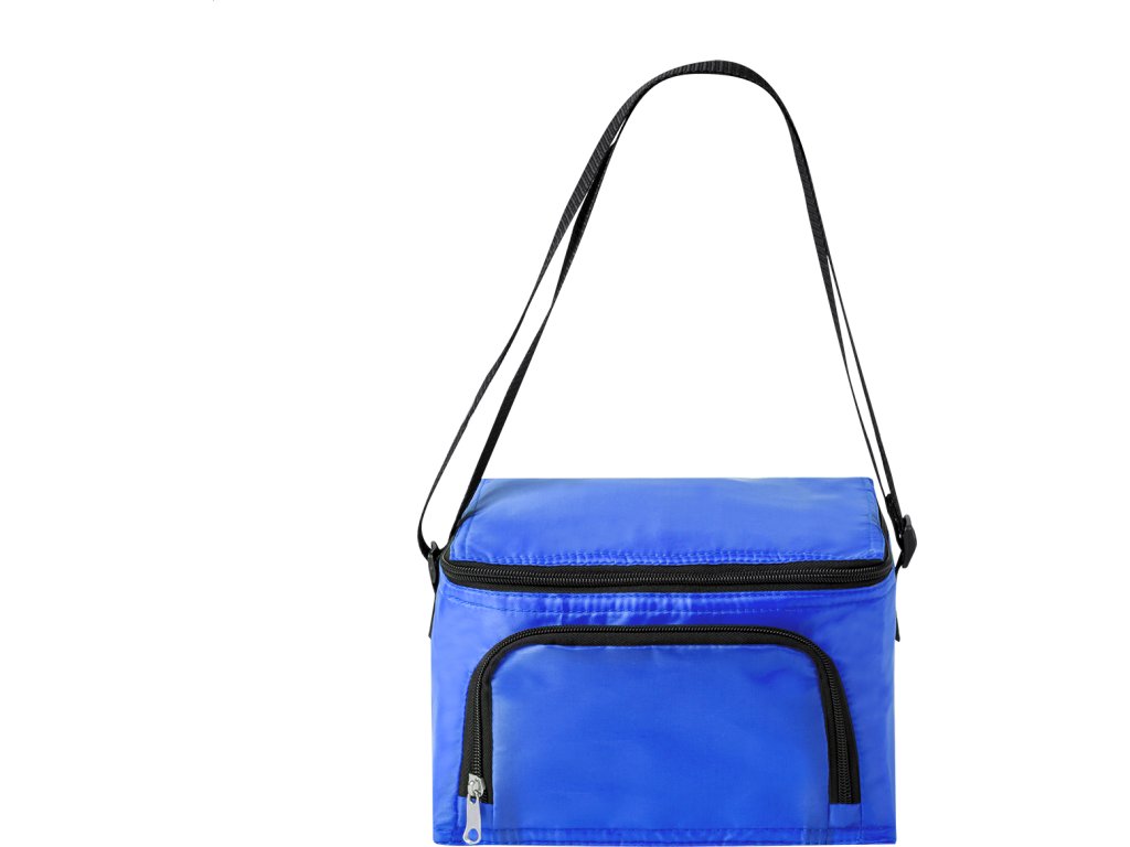 Polyesterová chladicí taška s přihrádkami na zip, hliníkovým polstrováním a ramenním popruhem. Pro 6 ks plechovek 0,33L. 210D polyester.