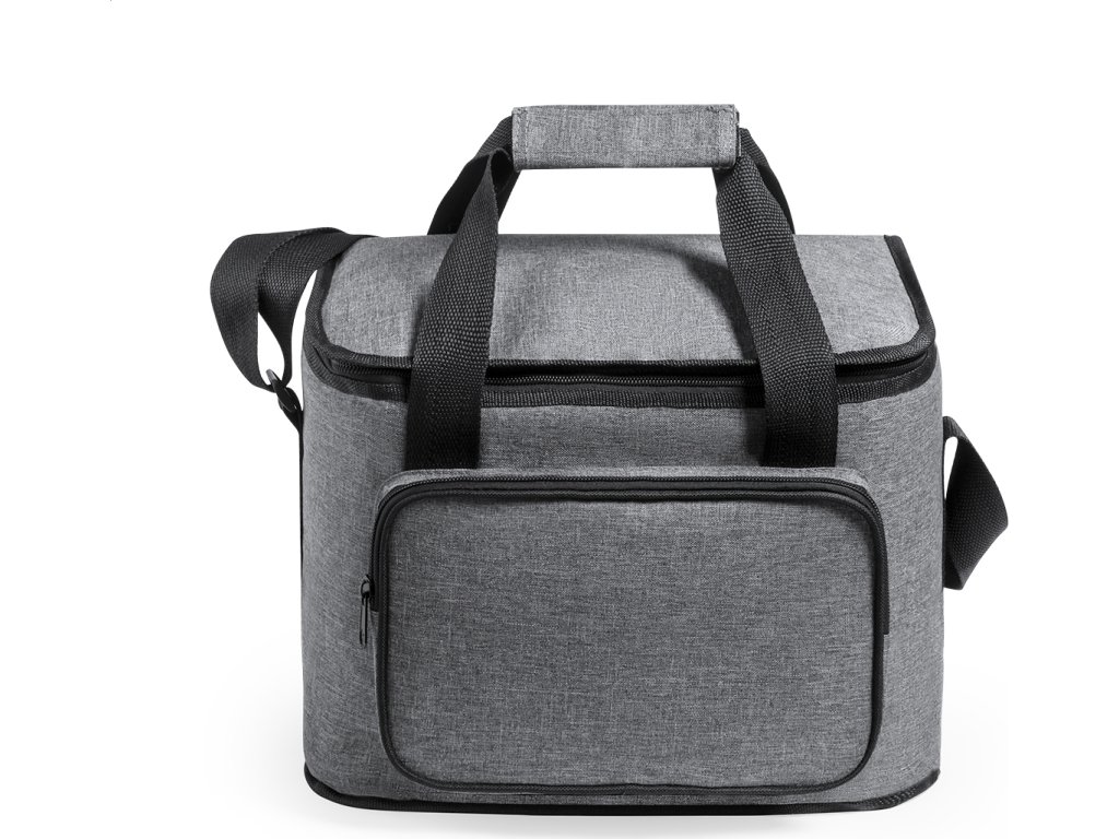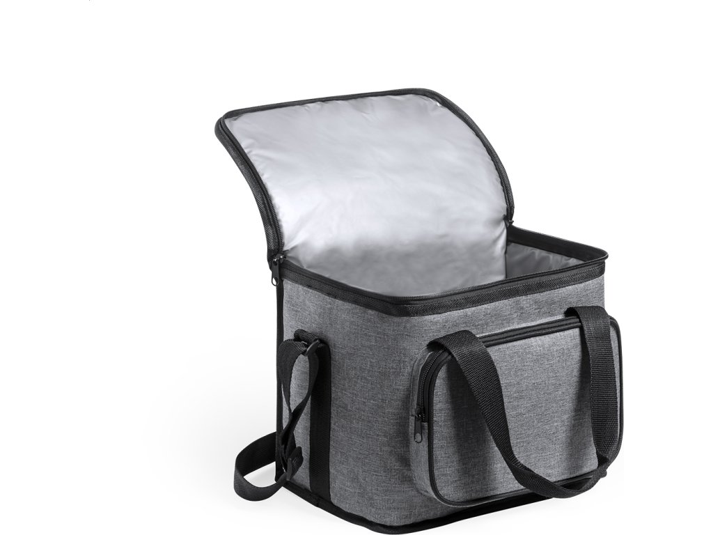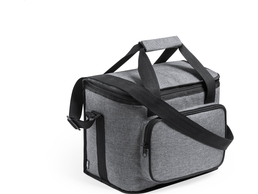 Chladicí taška RPET s polstrováním PEVA, přihrádkami na zip, ucha se suchým zipem a nastavitelným ramenním popruhem. S výrazným štítkem RPET. 600D RPET polyester.
