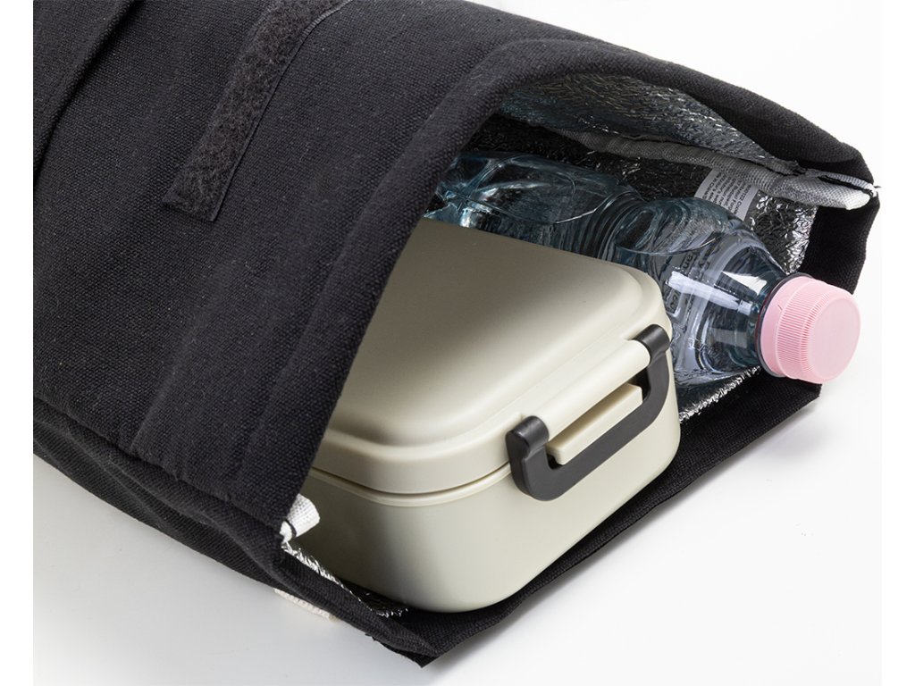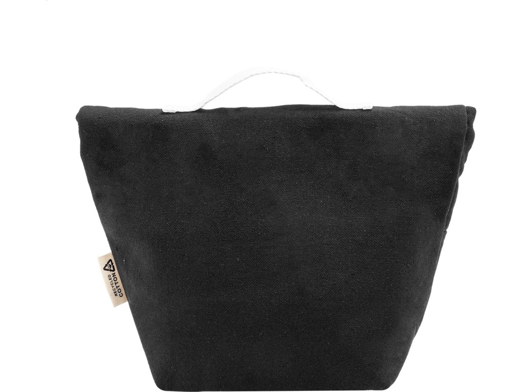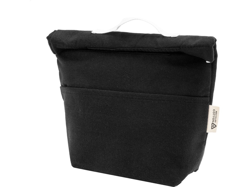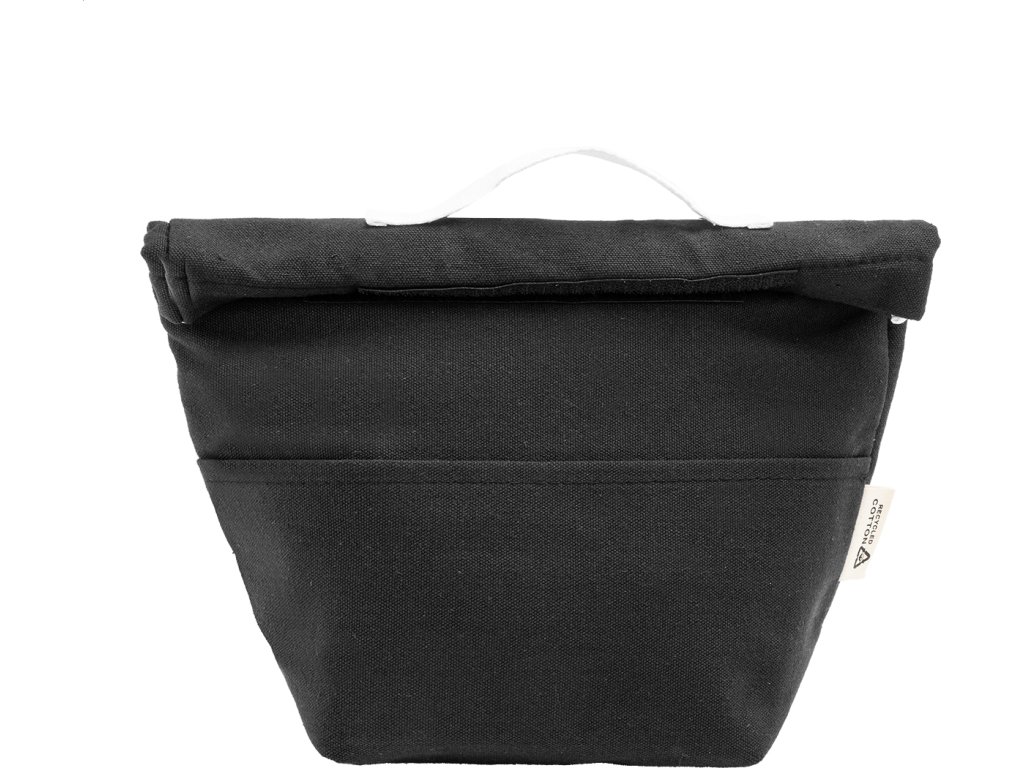Chladicí taška z recyklovaného plátna s rolovacím vrškem, přední kapsou, hliníkovou výplní a zapínáním na suchý zip. 70 % recyklované bavlny a 30 % RPET polyesteru. S výrazným štítkem recyklované bavlny.