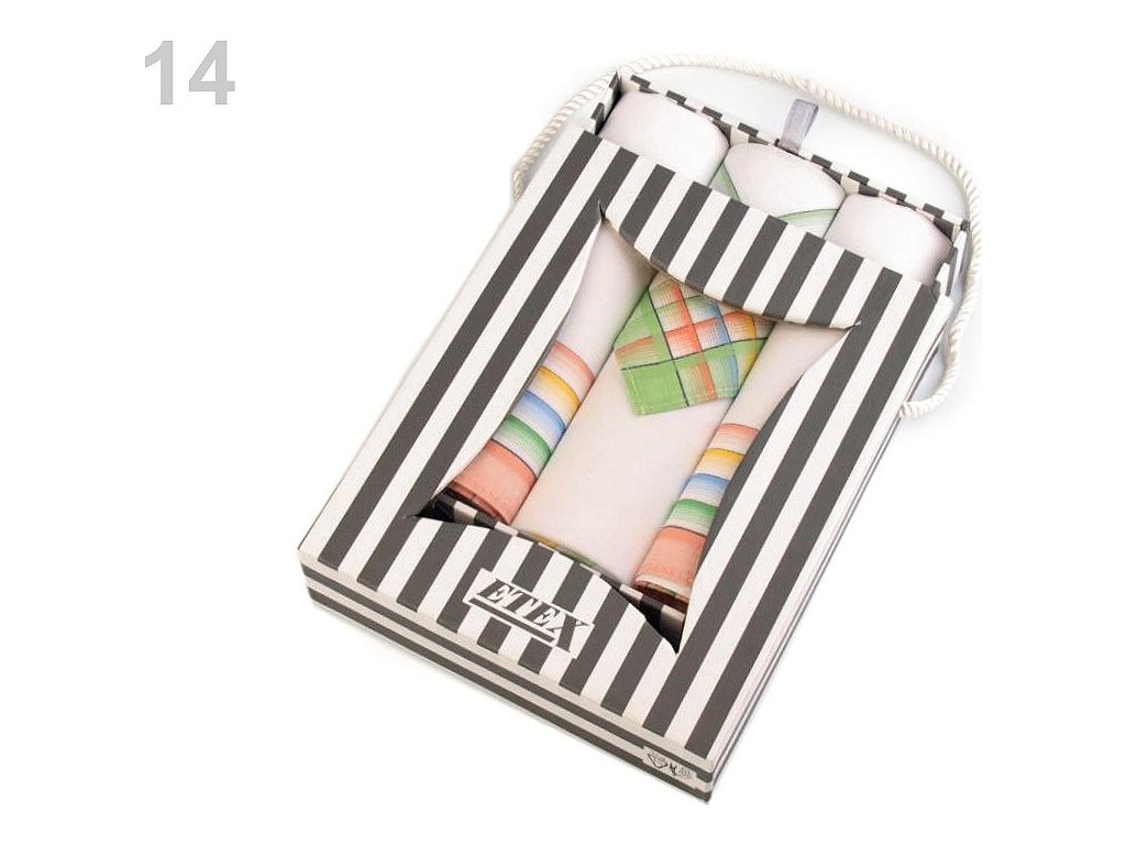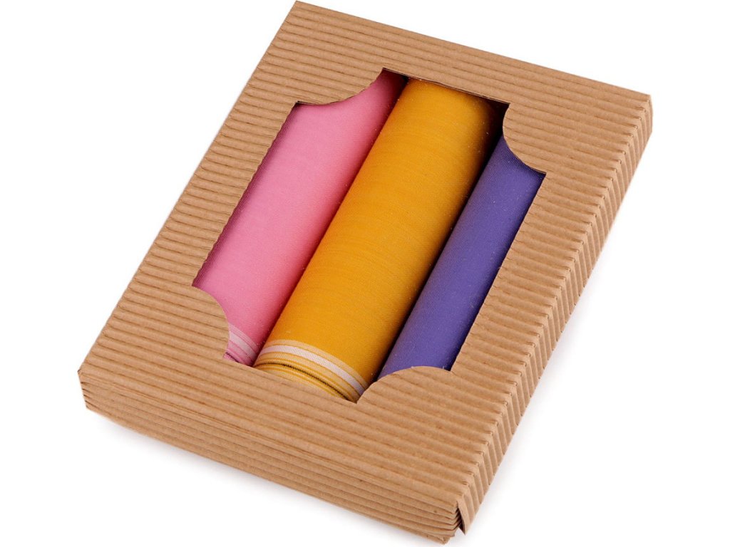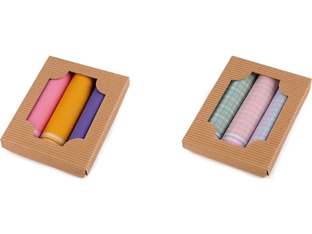 Luxusní sada dámských kapesníků je vhodná pro všechny ženy. Kvalitní bavlněné kapesníky mají klasické dezény proužků a kára. Kapesníky jsou zabalené v dárkové krabičce z vlnité lepenky přírodního vzhledu s průhledem. Mohou vám posloužit jako hodnotný dárek. V krabičce najdete 3 čtvercové kapesníky. Varianta "mix" obsahuje druhy kapesníků, které máme právě skladem. Skladba kapesníků u jednotlivých variant se může mírně lišit.