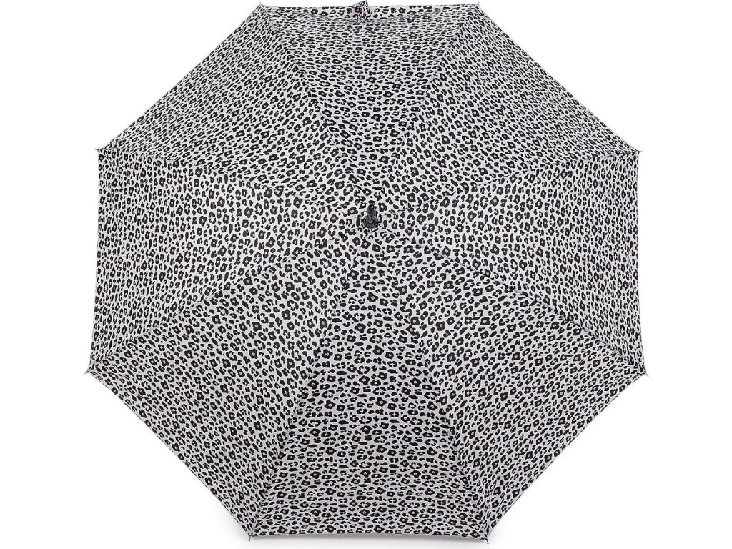 Velký dámský deštník se zvířecím vzorem je stylovým a praktickým doplňkem pro každou ženu. Díky svému atraktivnímu designu, dodá šarm i těm nejzamračenějším dnům. Je vystřelovací, konstrukci má z kovového drátu a pružných lamel, které tvoří osm polí. Díky nim je velice pevný, neohne se ani za největšího nečasu. UV filtr vás ochrání před slunečním zářením. Klasická tyč je zakončená pevnou rukojetí. Hloubka deštníku je 26 cm.