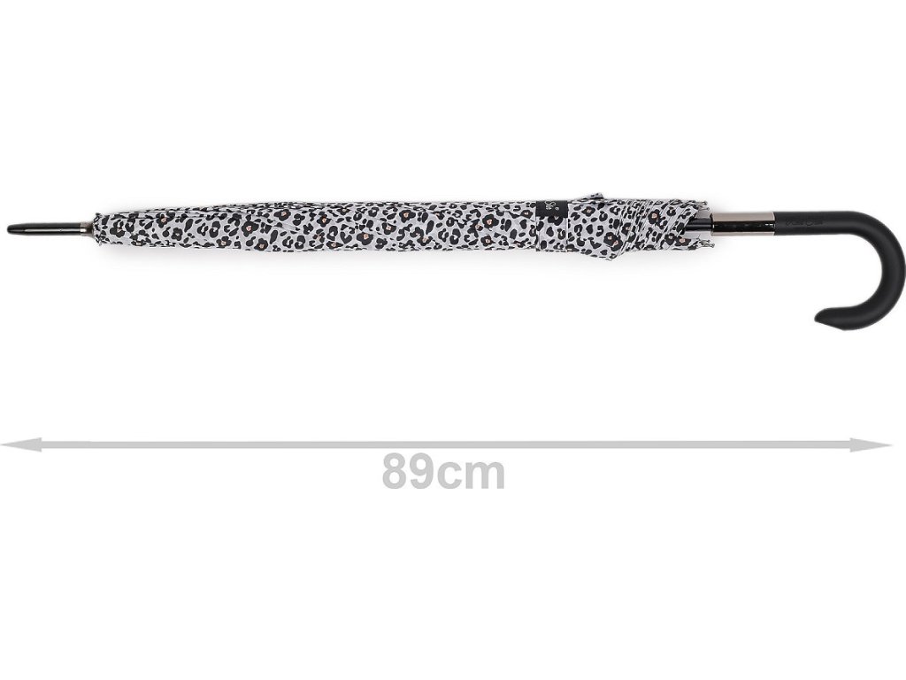 Velký dámský deštník se zvířecím vzorem je stylovým a praktickým doplňkem pro každou ženu. Díky svému atraktivnímu designu, dodá šarm i těm nejzamračenějším dnům. Je vystřelovací, konstrukci má z kovového drátu a pružných lamel, které tvoří osm polí. Díky nim je velice pevný, neohne se ani za největšího nečasu. UV filtr vás ochrání před slunečním zářením. Klasická tyč je zakončená pevnou rukojetí. Hloubka deštníku je 26 cm.