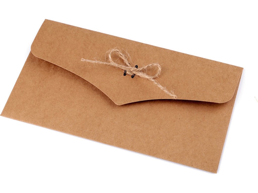Papírová obálka je vhodná k dotvoření. Můžete ji pokreslit, pomalovat, využít techniky scrapbooking apod. Uzavírá se suchým zipem. Na finální dozdobení můžete využít jutový provázek, který je součástí balení. Obálka je dostatečně prostorná a pevná, vhodná na dárkové poukazy, peníze, přáníčka. Je typu DL, s hladkým povrchem, dovnitř se vejde papír A4 přeložený na třetiny.