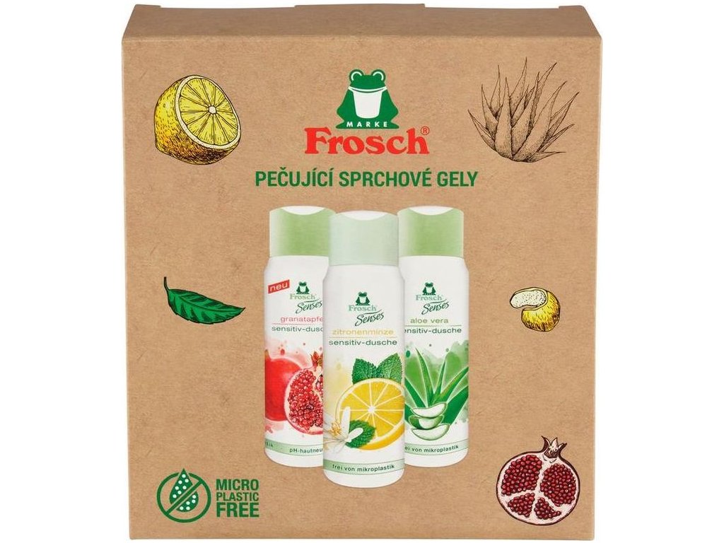 Dárkovou soupravou Frosch potěšíte nejen své blízké, ale také přírodu. Produkty se zelenou žabičkou na obalu jsou přátelské k naší pokožce i životnímu prostředí díky šetrnému a v přírodě odbouratelnému složení, ekologické výrobě i recyklovaným a opětovně recyklovatelným obalům. Výrobky jsou veganské.