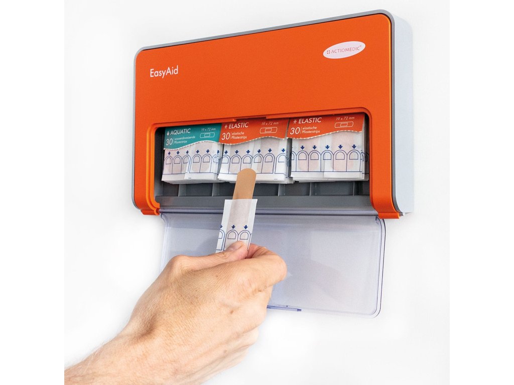 Jednoruční dávkovač náplastí, který pojme až tři druhy náplastí. Potřebu doplnění indikuje inteligentní systém Kanban. Hygienická výjimka otvorem směrem dolů. Volitelně lze uzamknout proti krádeži. Uzavřené pouzdro chrání obsah před kontaminací i v náročných prostředích. Je snadno rozpoznatelný díky oranžovému označení. Obsahuje také instalační materiál a návod k použití. 1x 30 ks ELASTIC, 1x 15 ks ELASTIC na konečky prstů a 1x 30 ks AQUATIC obvazy na rány. Velikost standardních omítek je: 19 x 72 mm.