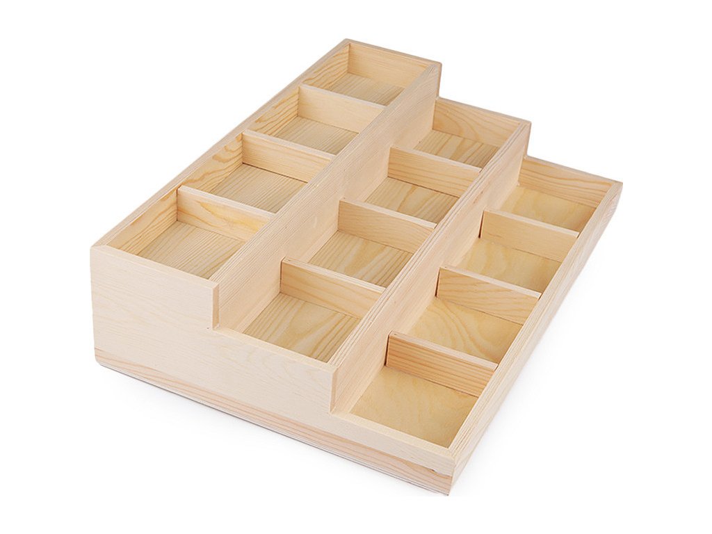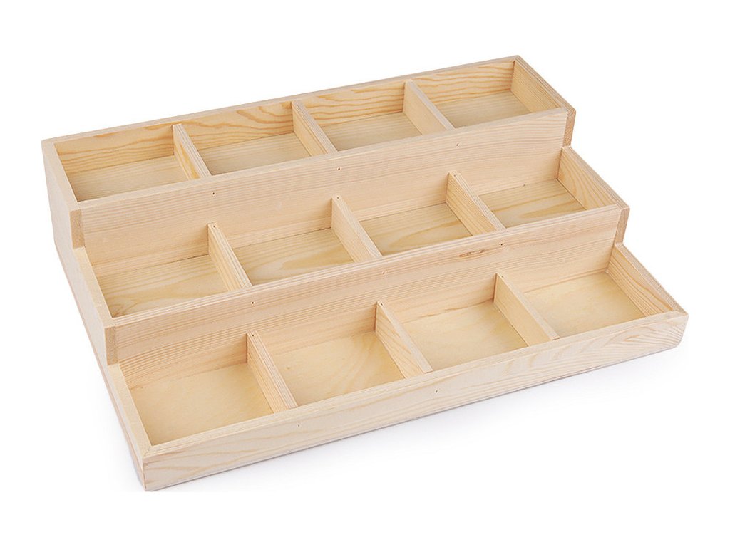 Dřevěné 3 patrové plato je ideální na vystavení minerálů i polotovarů z nich (náramků, přívěsků apod.). Najde využití i jako organizér v domácnosti, do skříně, šuplíku apod. V platu je 12 přihrádek. Přihrádky mají rozměr 7 x 8 cm. Hloubka přihrádky je 2,5 cm.