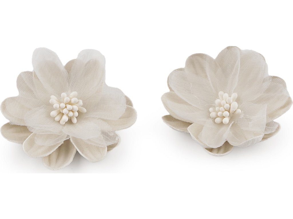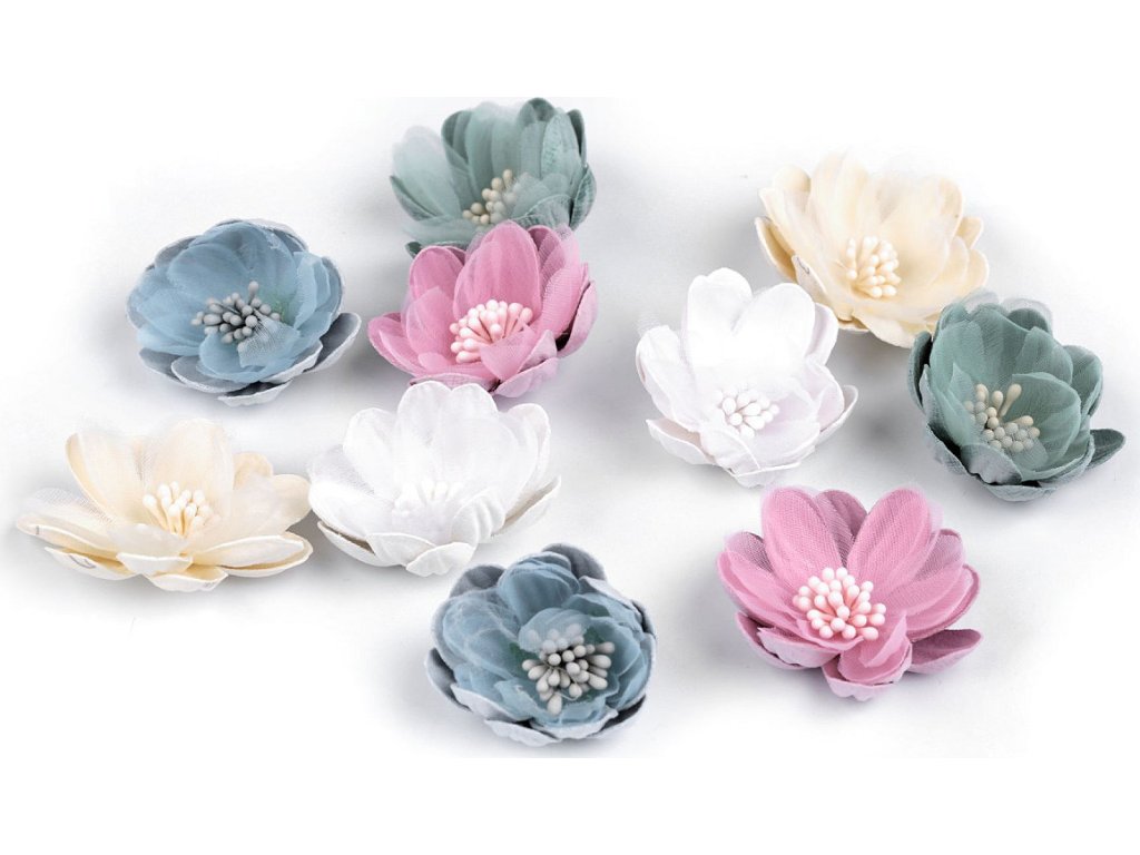 Textilní květy s pestíky dokonale doplní vaše květinová aranžmá, ikebany nebo věnce. Jsou detailně propracované. S květy nevšedně ozdobíte také čelenky, sponky do vlasů či fascinátory. Můžete je přilepit i přišít. Barva pestíků se může lišit.