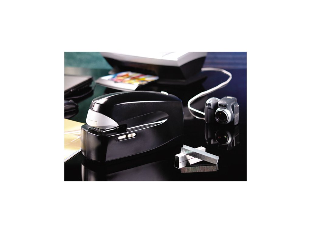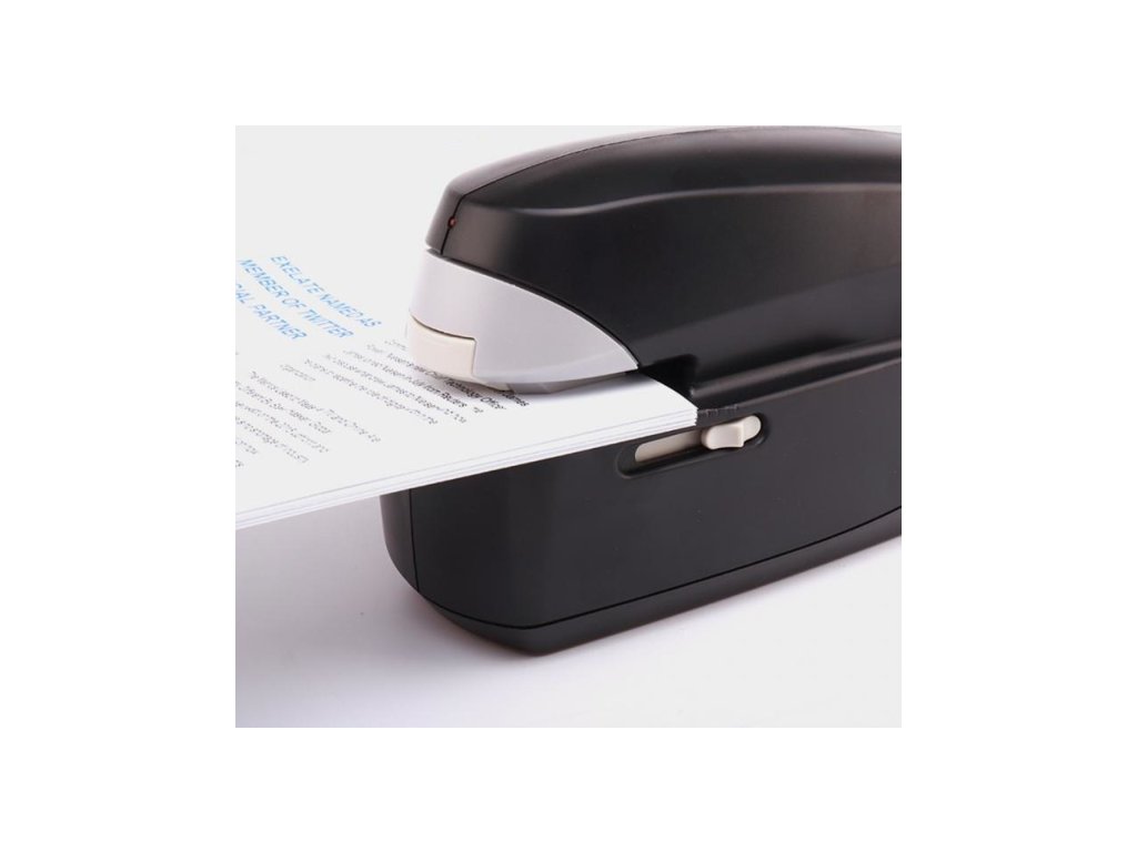 Elektrická sešívačka s posuvným mechanismem, který umožňuje měnit hloubku šití 8 až 35 mm. Kapacita šití 25 listů (papíru 80 g/m2). Vhodná pro časté používání. Kapacita zásobníku 210 spon. Stolní sešívačka s moderním ergonomickým designem. standardní sešívání, přední plnění spon automatický start světelná signalizace prázdného zásobníku elektrický pohon 220 V druh spon 24/6 nebo 26/6 barva černá rozměry: 80×120×215 mm hmotnost: 1,5 kg