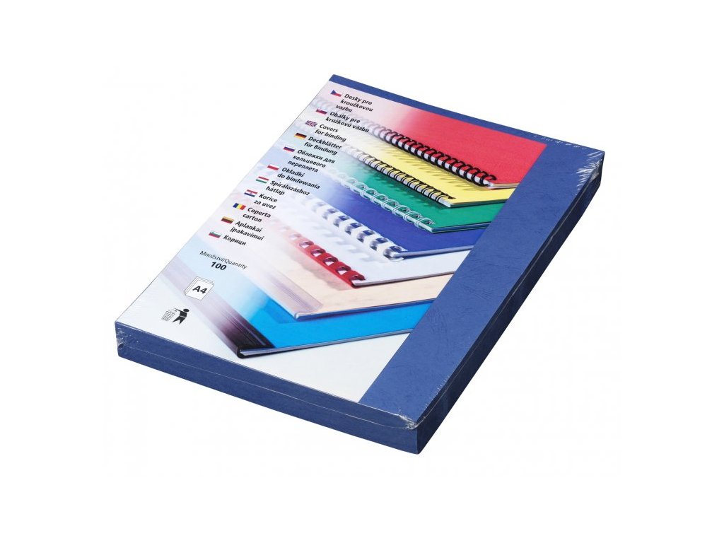Vázací kartonový kryt Eurosupplies ve formátu Delta A4 v tmavě modré barvě má na jedné straně ražbu povrchu v imitaci kůže a jeho druhá strana je hladká matná v barvě desek. Balení obsahuje 100 ks těchto krytů.