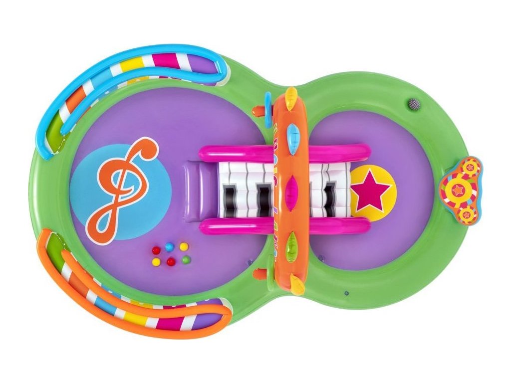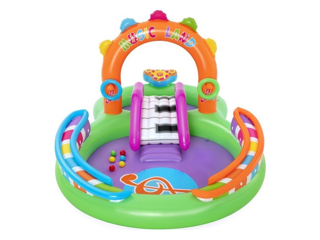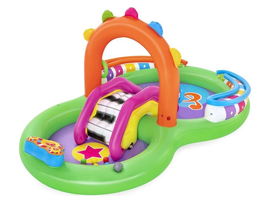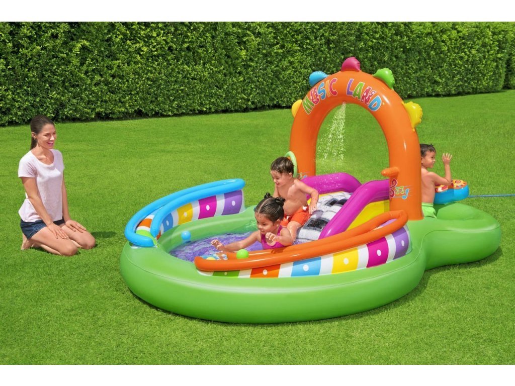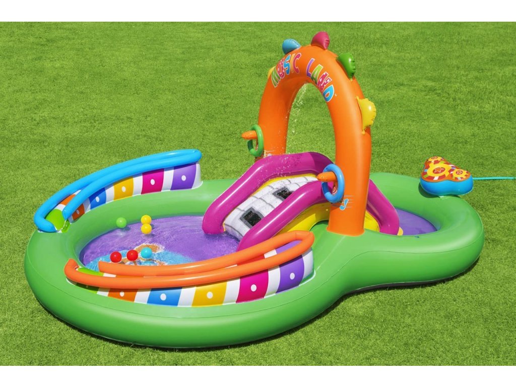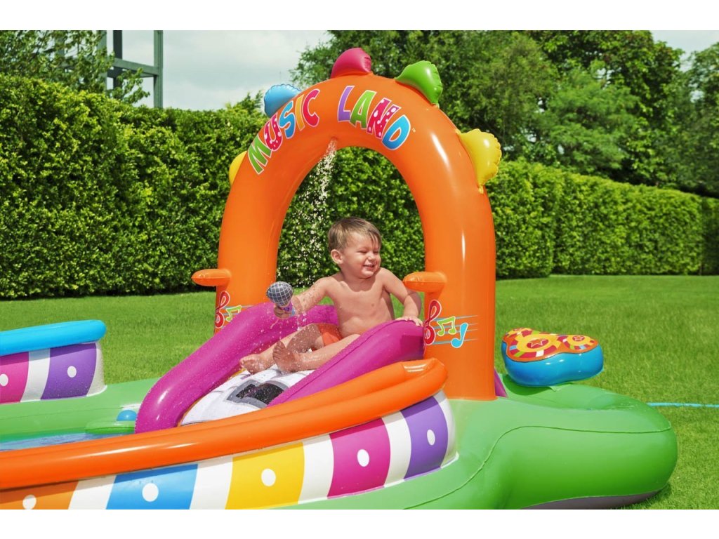 Hrací centrum obsahuje mikrofon a buben, se kterými si děti mohou hrát a zapojí tak svou fantazii. Dvojité bazény jsou propojeny odnímatelnou skluzavkou uchycenou lany a poutky. V podlaze je zabudovaný nafukovací polštář pro měkký dojezd ze skluzavky. Oblouk s vestavěným rozstřikovačem stačí připojit na zahradní hadici. Na hroty na oblouku můžete házet nafukovací kroužky. Součástí sady je 6 barevných míčků, které můžete spouštět dolů po jedné i druhé rampě. Tyto hry jsou nejen zábavné, ale rozvíjejí také koordinaci ruka-oko.Vypuštění vody je snadné a rychlé díky vypouštěcímu ventilu.