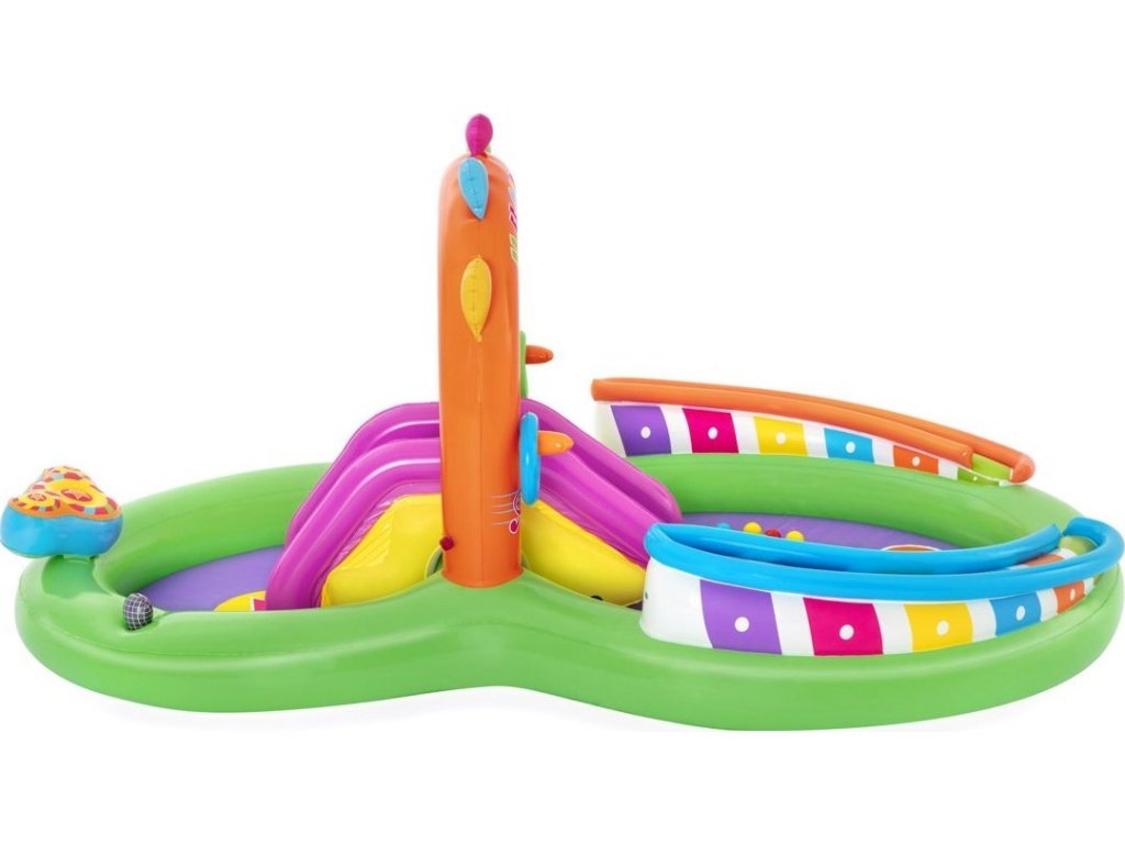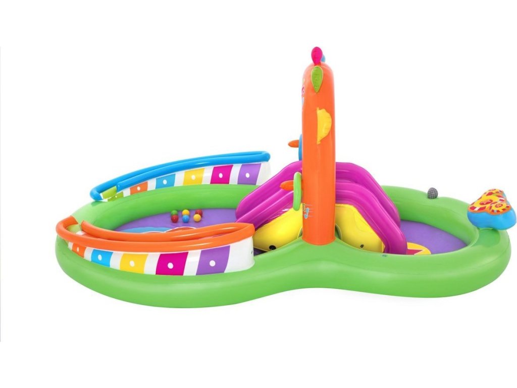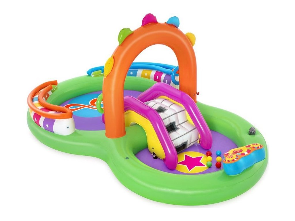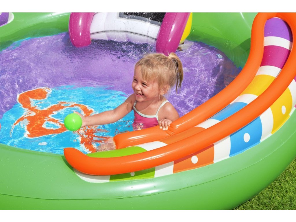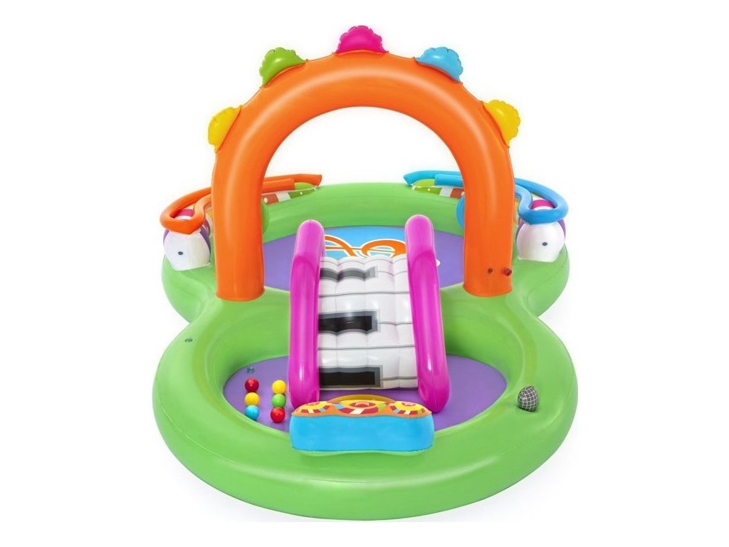 Hrací centrum Bestway s dvěma bazénky a skluzavkou. Oblouk s vestavěným rozstřikovačem. Dva nafukovací kroužky k házení na cíl. Dvě dráhy na míčky, včetně 6 míčků na hraní. V podlaze je nafukovací polštář pro pohodlný dojezd ze skluzavky.