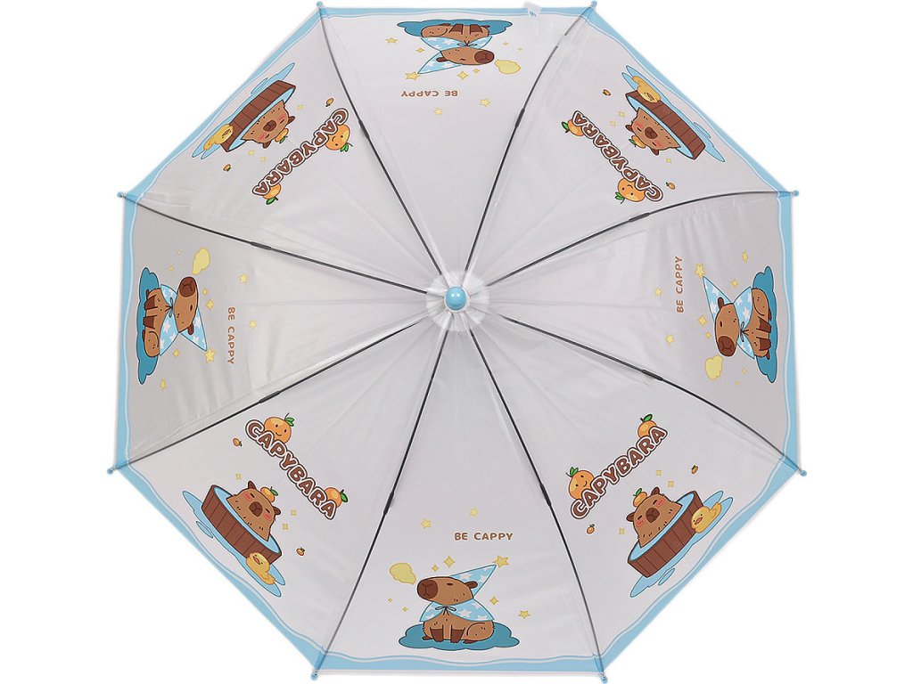 Dětský vystřelovací deštník s motivem kapybary je ideálním společníkem pro deštivé dny. Tento deštník je navržený s ohledem na potřeby dětí, kombinuje stylový vzhled s praktičností. Potah je průsvitný, na rukojeti má deštník visačku, na kterou můžete napsat jméno dítěte. Má klasickou tyč zakončenou pevnou rukojetí. Konstrukce deštníku je z pružných lamel a tvoří osm polí. Hloubka deštníku je 23 cm.