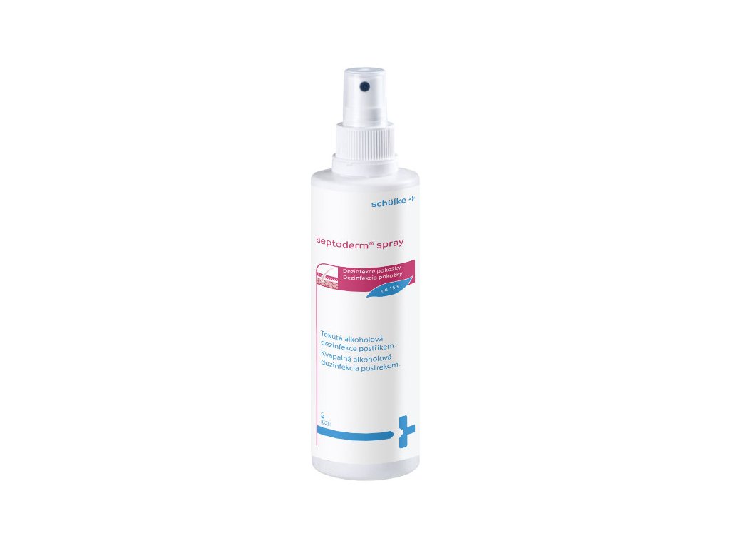 Tekutá alkoholová dezinfekce postřikem Septoderm spray.Vyrobeno v ČR.