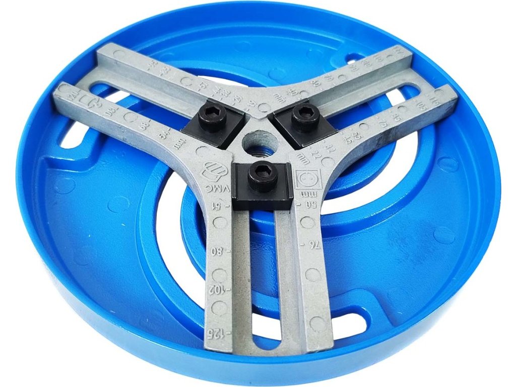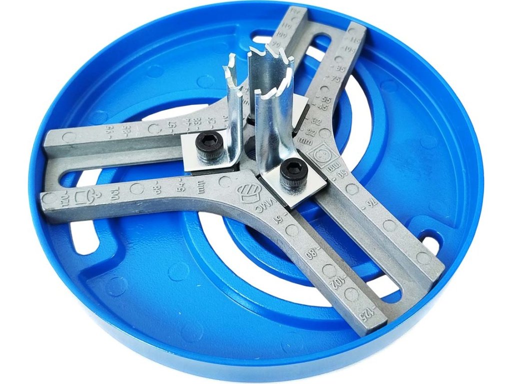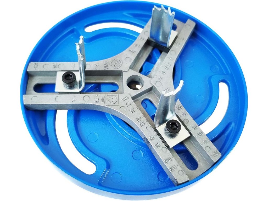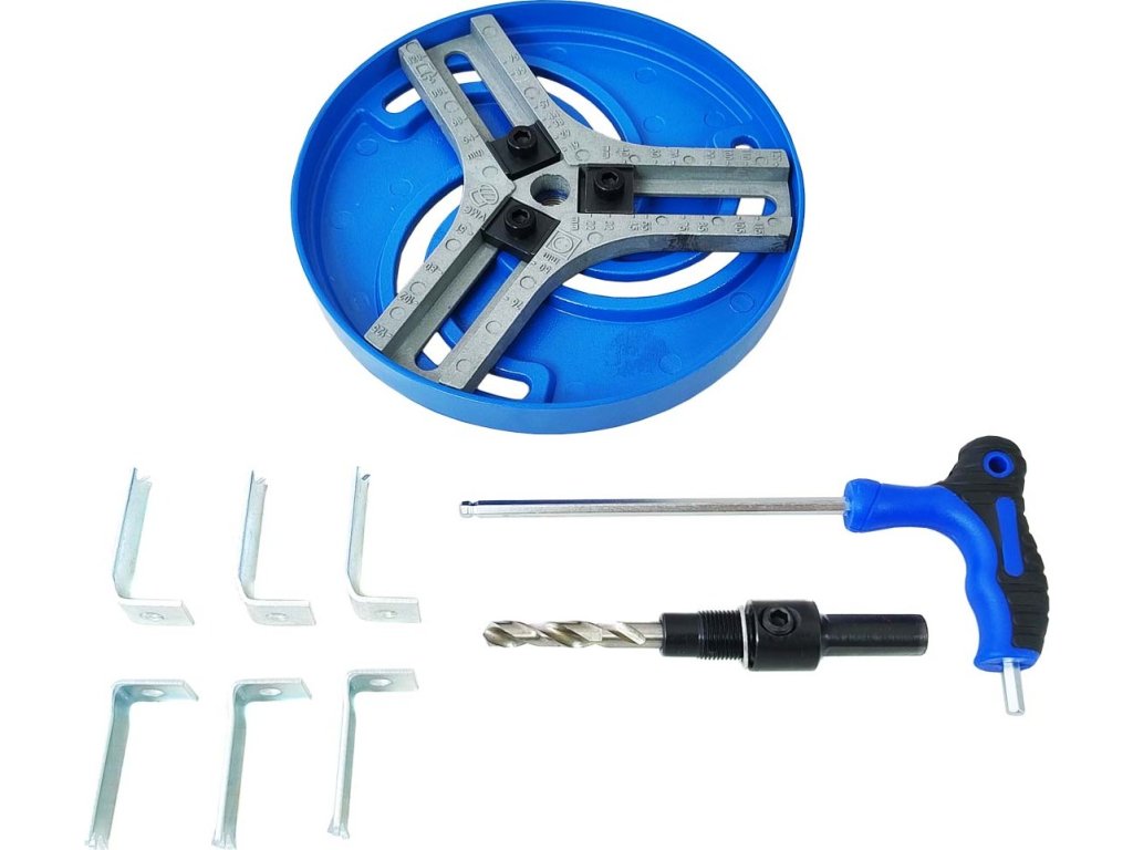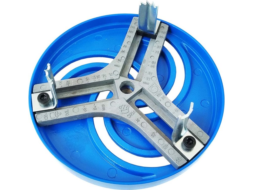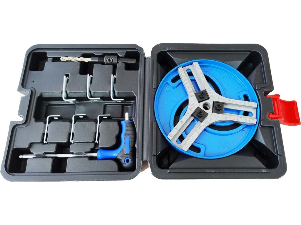 Pomocí této nastavitelné děrovky lze vrtat otvory o velikostech v rozsahu 19 až 130 mm. Potřebujete pouze jeden výrobek na všechny průměry! Tři pilové nože s přehledem prořežou sádrokarton i desky z měkkého dřeva a jejich speciální ozubení zajistí jemné a čisté řezy. Nastavení velikosti se provádí ve 3 jednoduchých krocích: uvolnění, synchronní nastavení a fixace. Integrovaná milimetrová stupnice spolu se stupnicí pro běžné montážní průměry Vám na první pohled pomohou najít správný průměr. Pracovní prostor je chráněn velkým vrtacím talířem.
