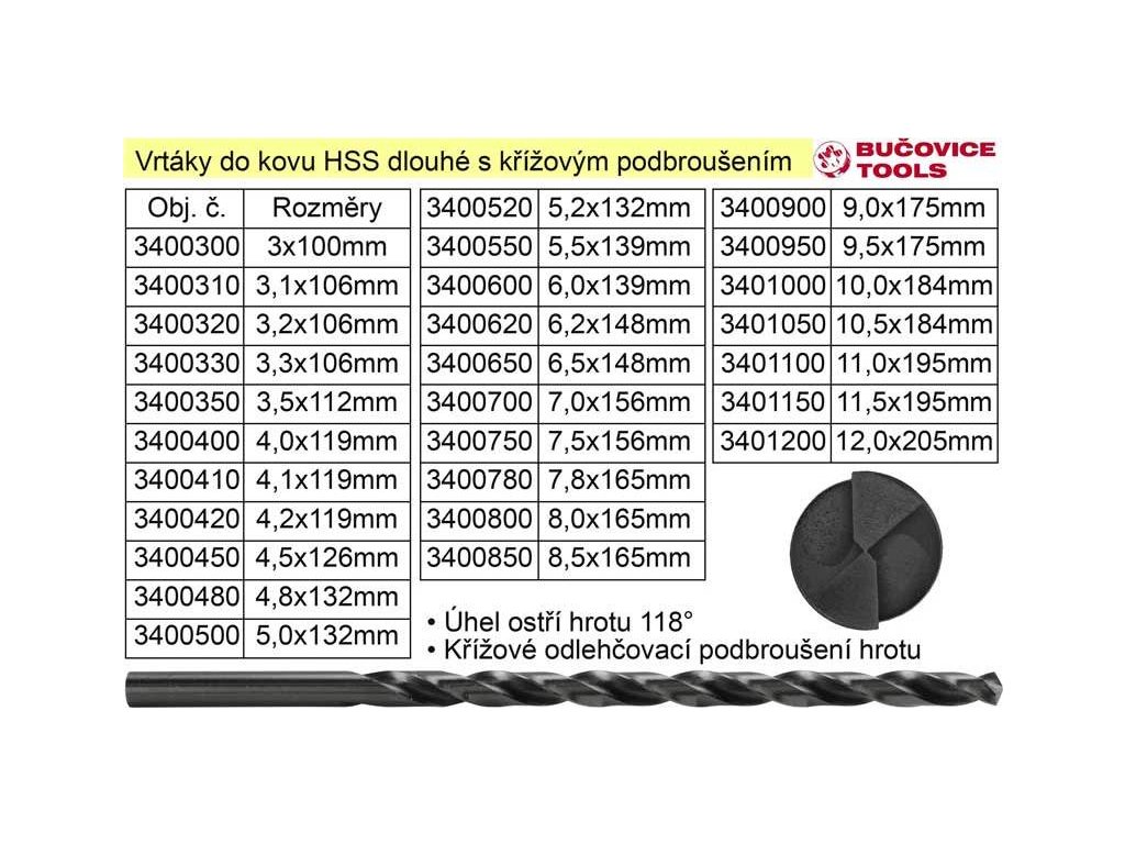 Spirálový vrták na ocel v kvalitě HSS s válcovou stopkou prodloužený broušený, s podélným spirálovým ostřím (fasetkou) a ostřím na hrotu 118° s odlehčovacím křížovým podbrusem. Výrobek pro profesionální použití od Českého výrobce Bočovice Tools.