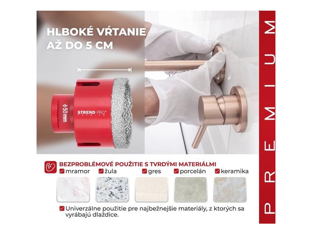 Diamantová korunka Premium je vhodná pro vyřezávání všech druhů tvrzeného kamene a jeho sloučenin, keramických dlaždic, mramoru, gresu, porcelánu a žuly.