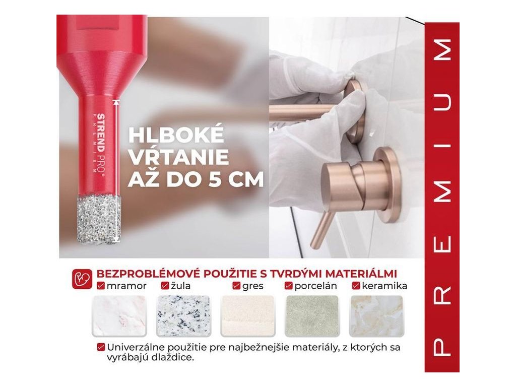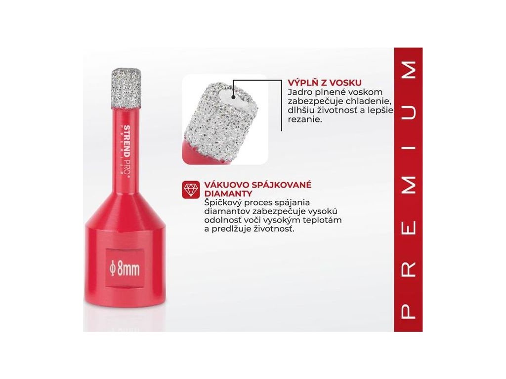 Diamantová korunka Premium je vhodná pro vyřezávání všech druhů tvrzeného kamene a jeho sloučenin, keramických dlaždic, mramoru, gresu, porcelánu a žuly.