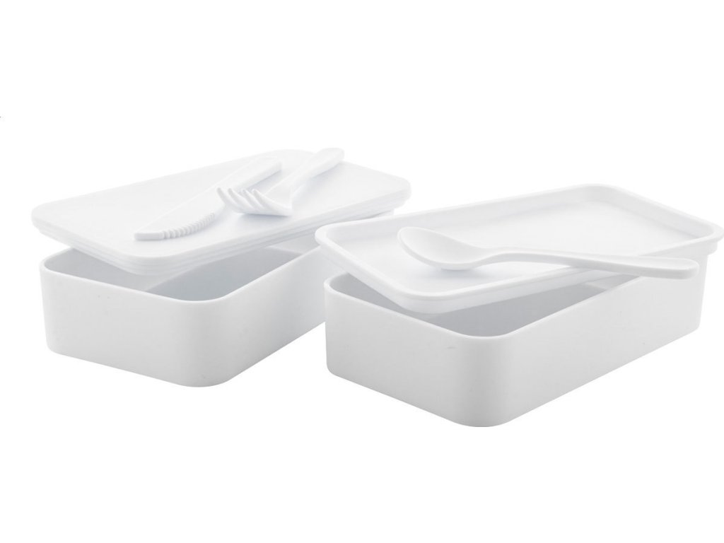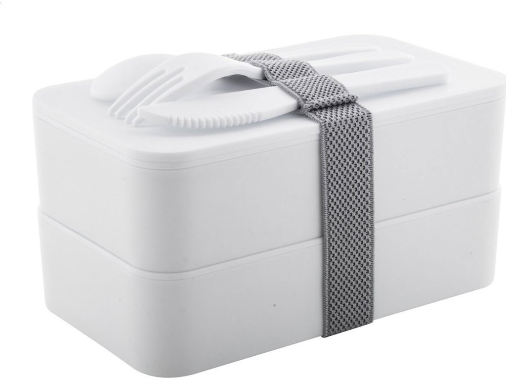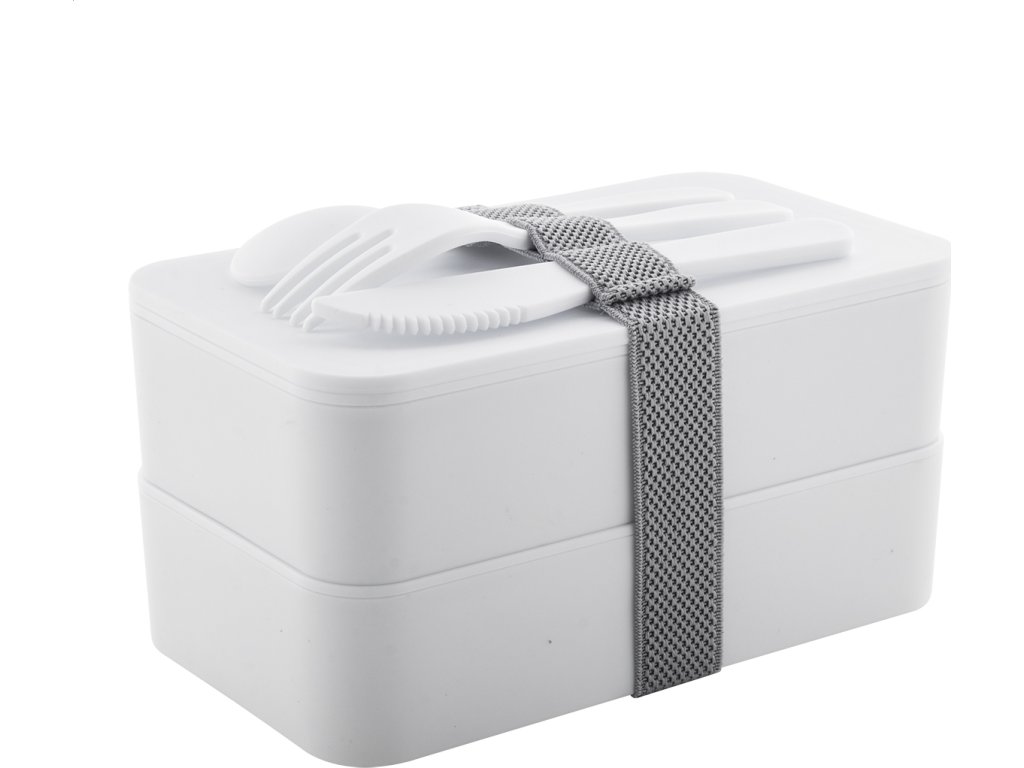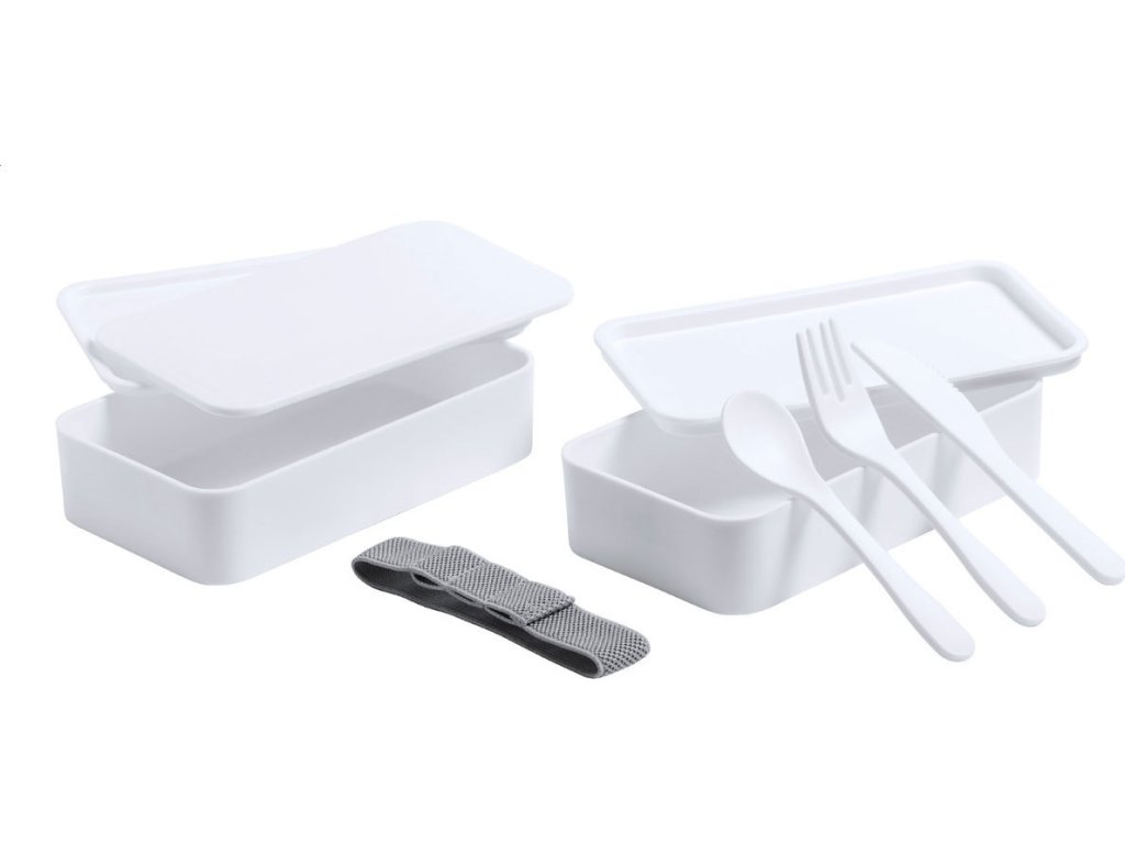 Box na jídlo z antibakteriálního plastu se sadou příborů (vidlička, lžíce a nůž) a elastickým popruhem. Každý má 2 oddíly o objemu 700 ml. V souladu s ISO 22196.