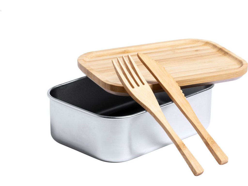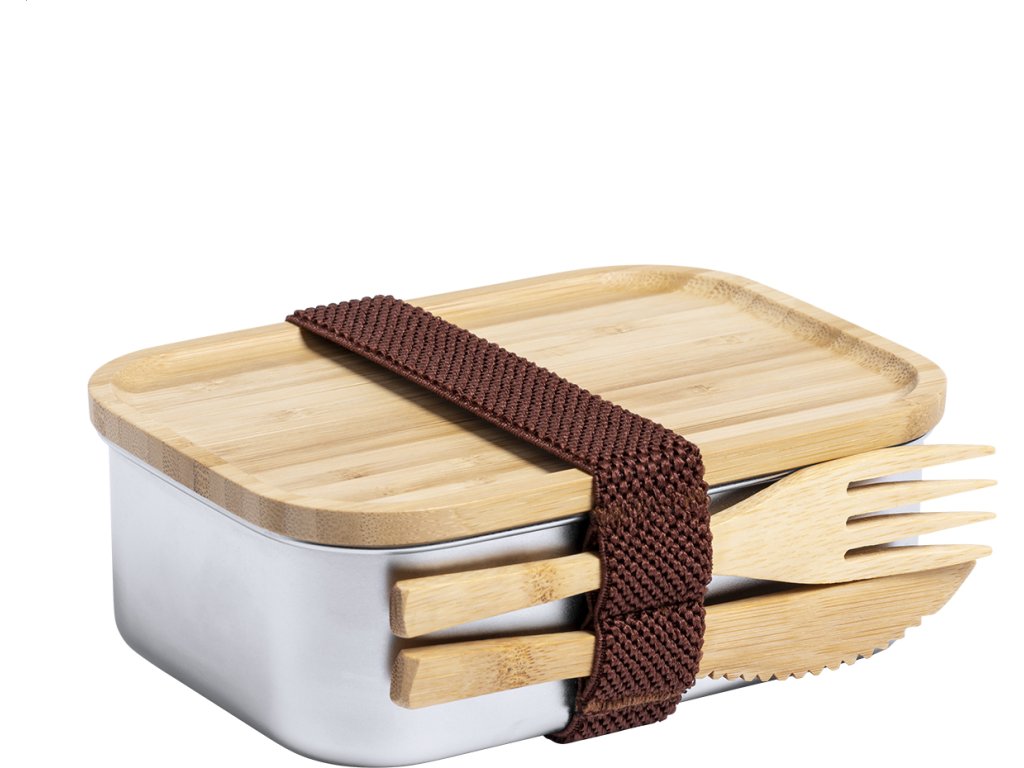 Box na jídlo z nerezové oceli s přírodním bambusovým víkem. Se sadou bambusových příborů (nůž a vidlička) a elastickým popruhem, 600 ml.