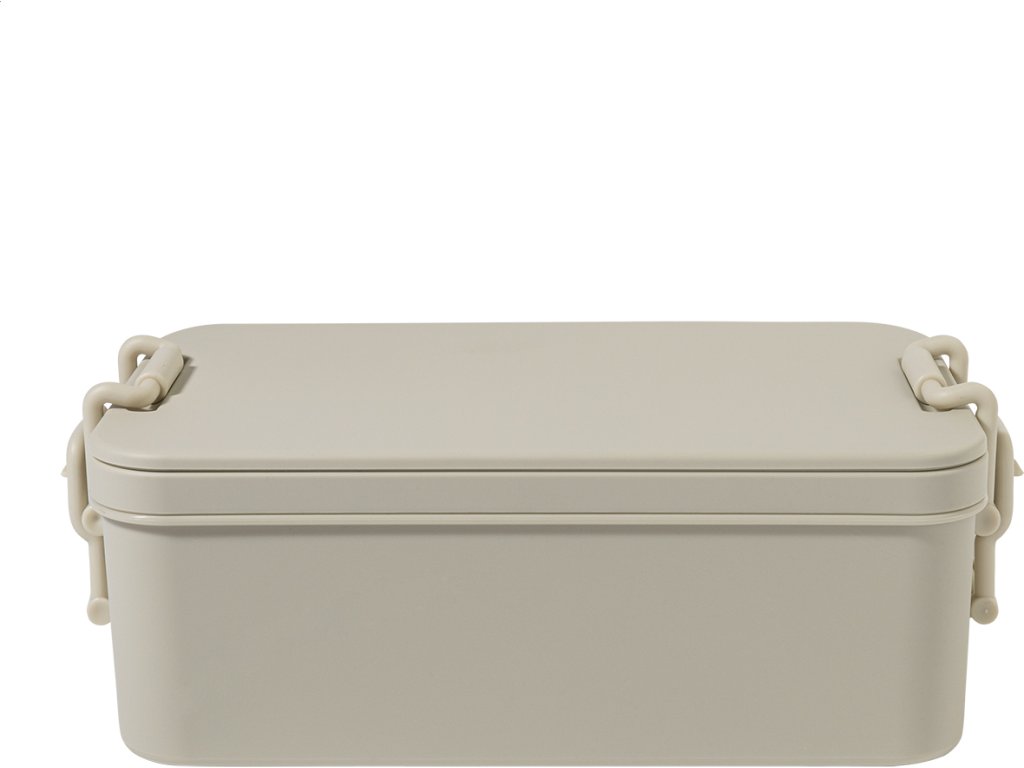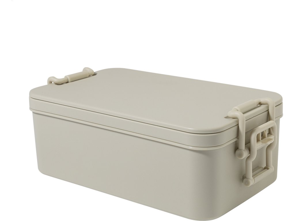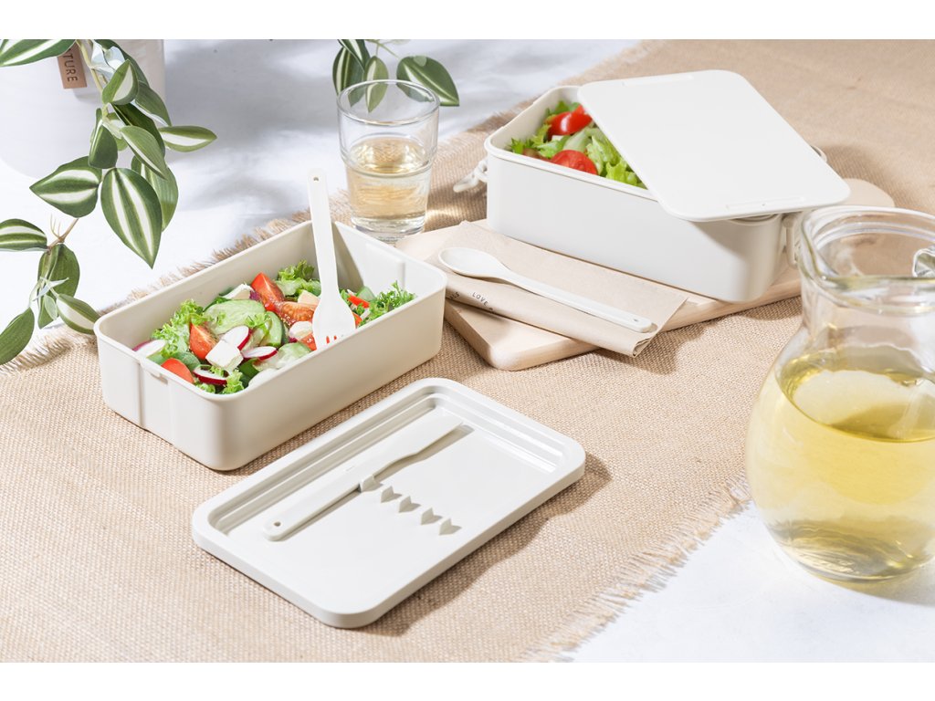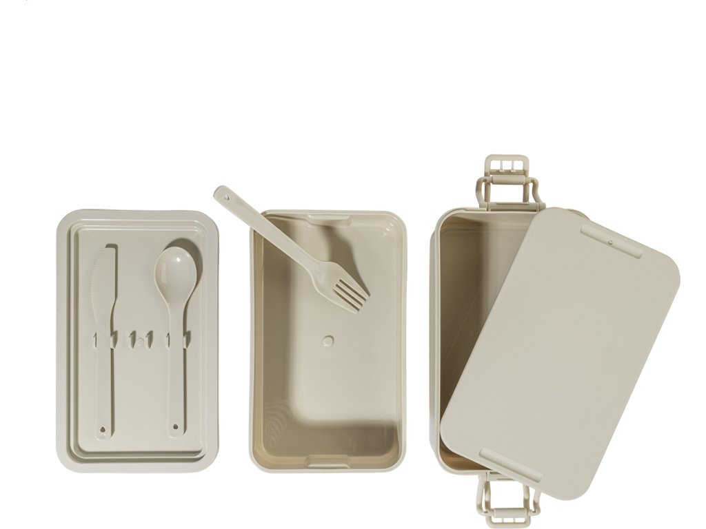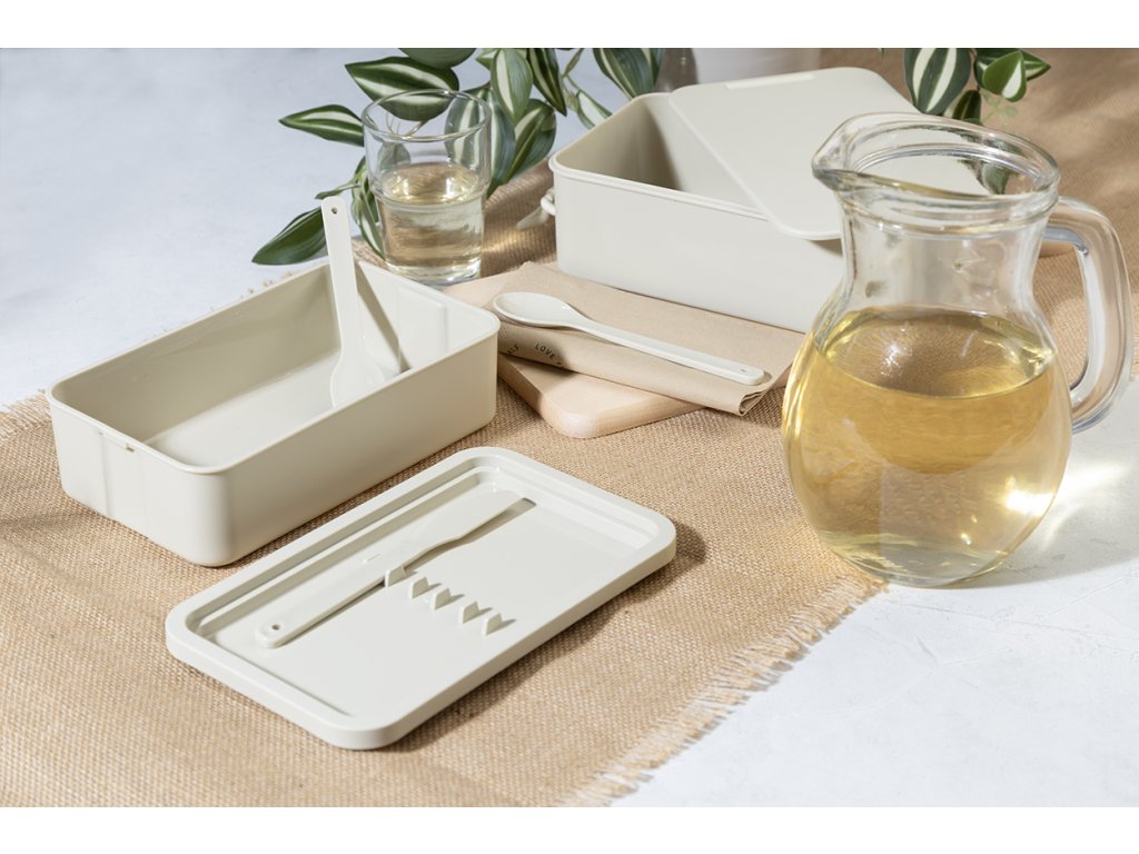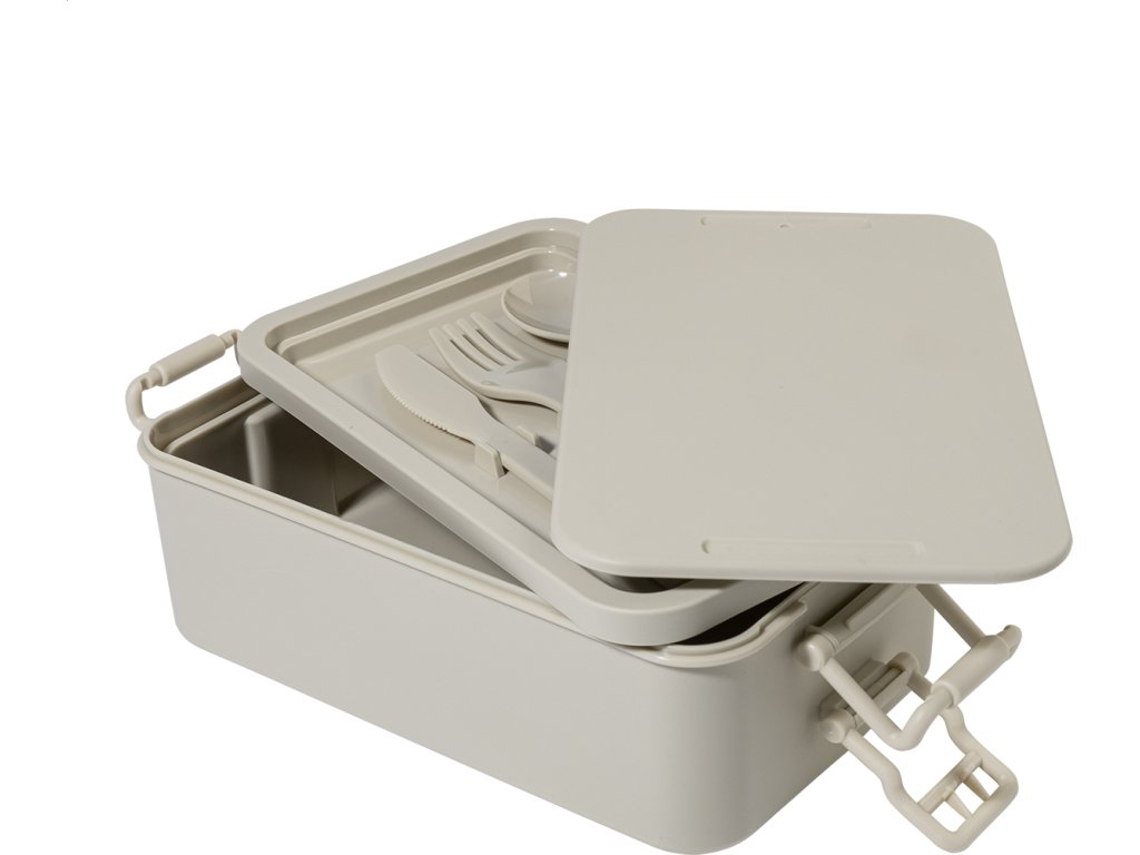 Box na jídlo z PP plastu se sadou příborů (vidlička, lžíce a nůž), zapínáním na přezku a 2 přihrádkami (1000 ml a 800 ml). Stohovatelný design pro kompaktní skladování.