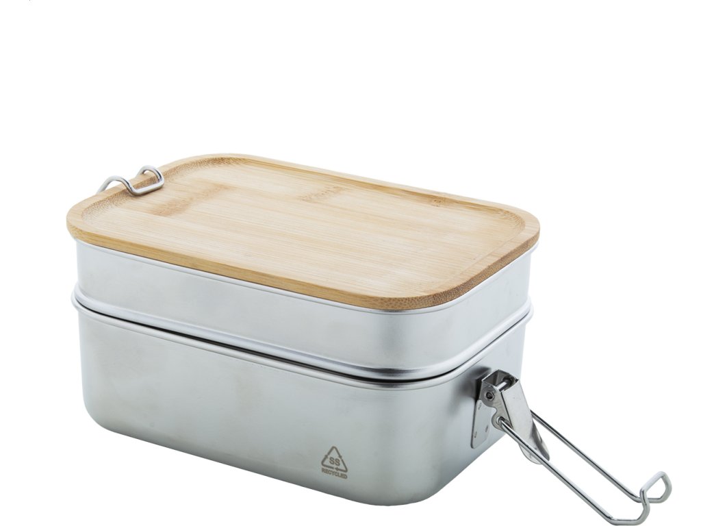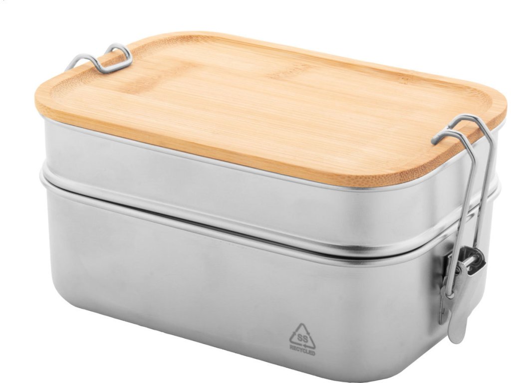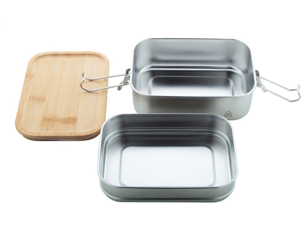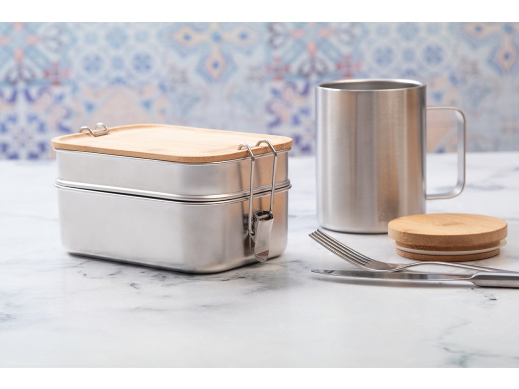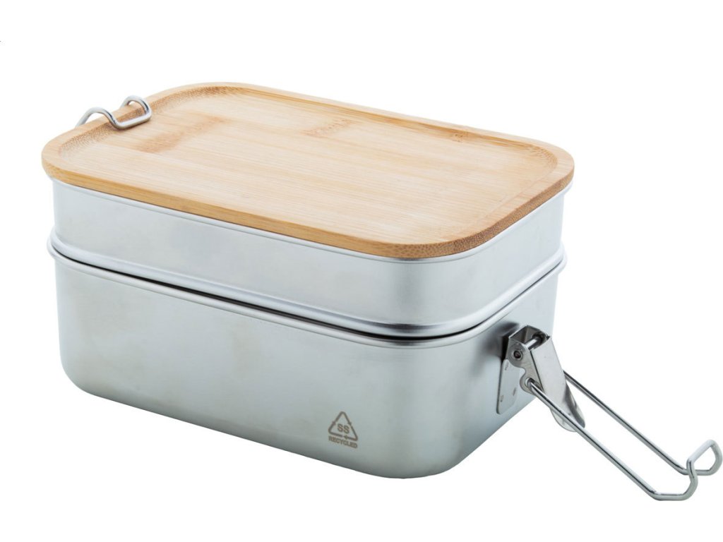 Box na jídlo z recyklované nerezové oceli s bambusovým víkem a bezpečným zavíráním na přezku. Se 2 přihrádkami o objemu 340 a 600 ml.