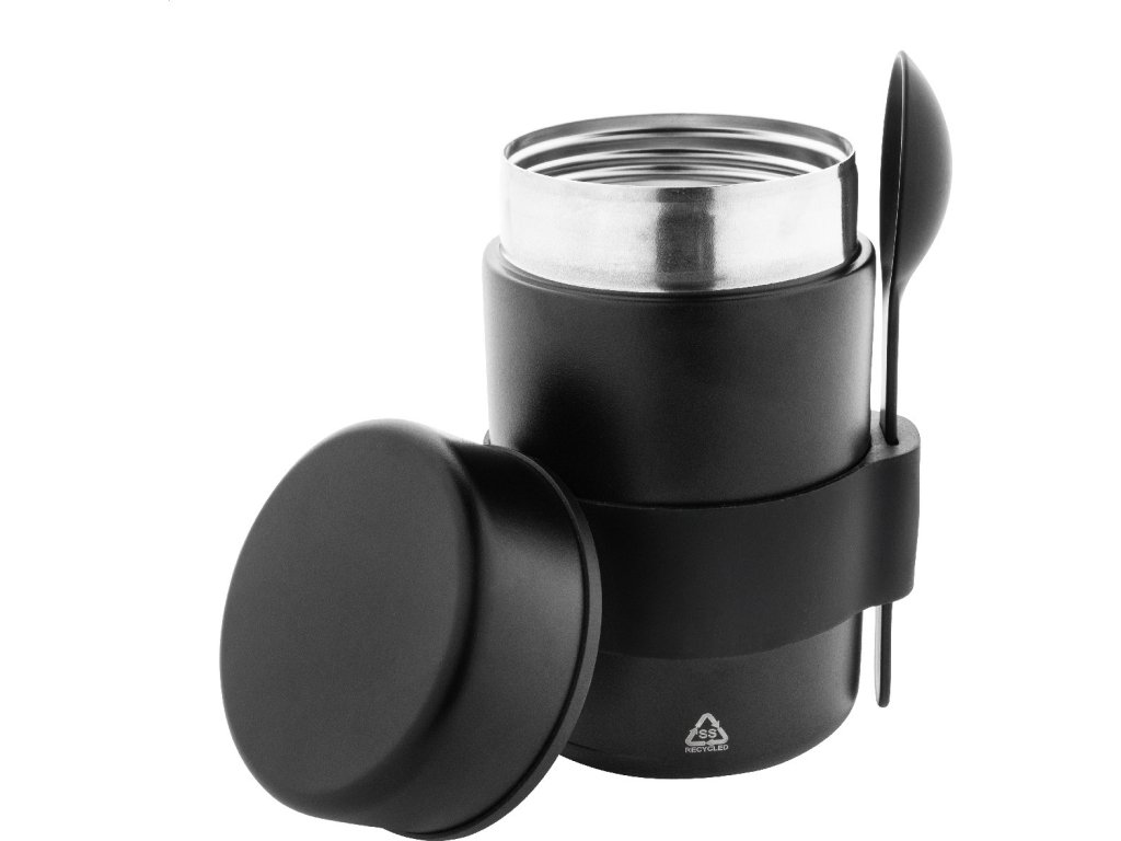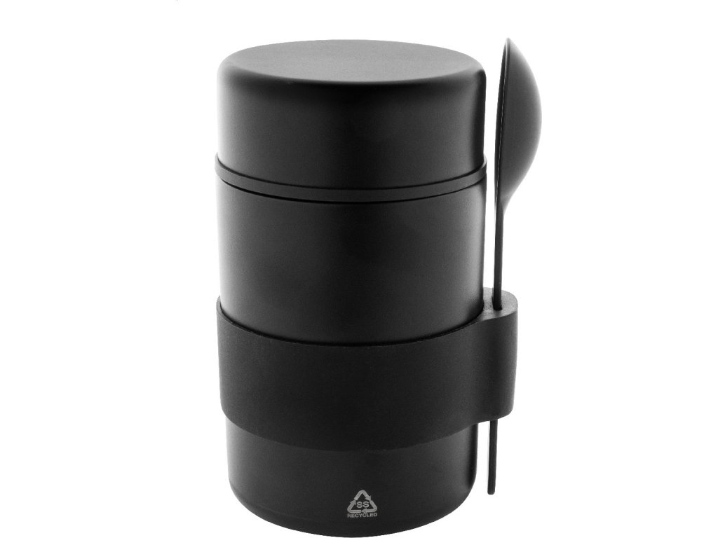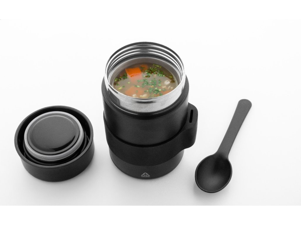 Dvoustěnná, vakuově izolovaná nádoba na jídlo z recyklované nerezové oceli se silikonovým úchopem a PP lžičkou. 450 ml.