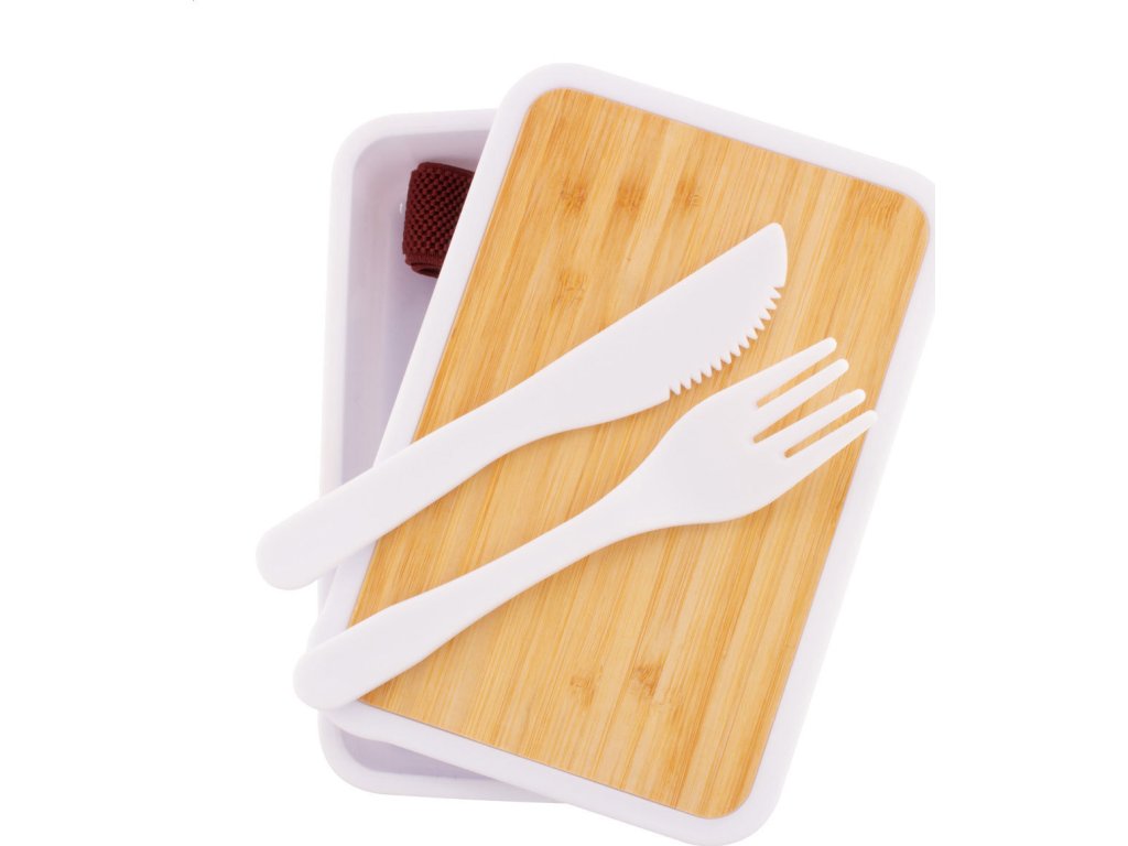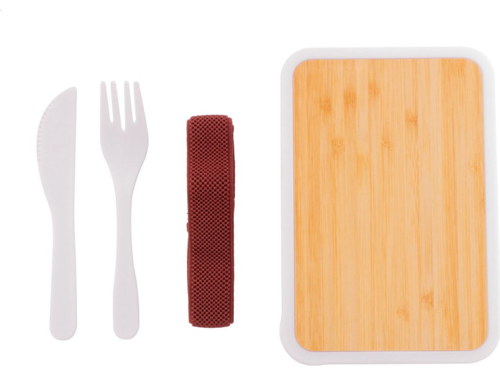 Box na jídlo z recyklovaného PP plastu s bambusovým víkem, sadou příborů (nůž a vidlička) a elastickým páskem. 500 ml.