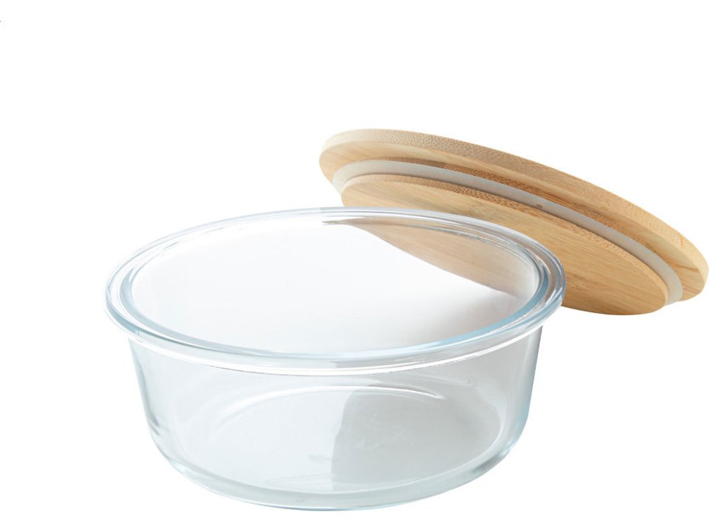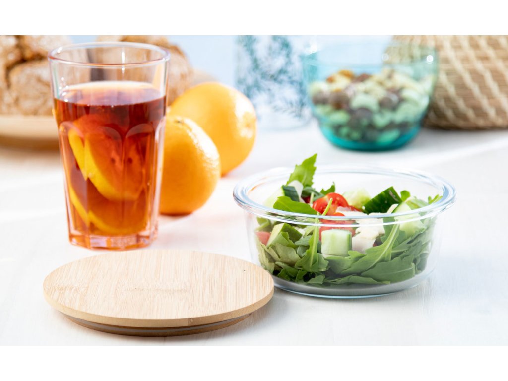 Skleněný kulatý box na jídlo s víčkem z přírodního bambusu, 650 ml.