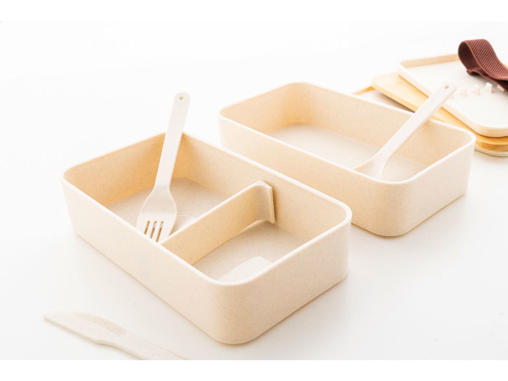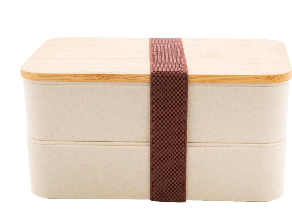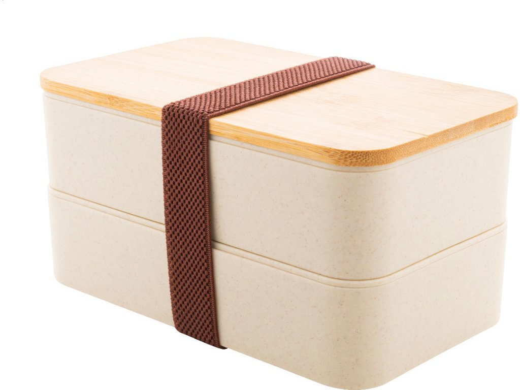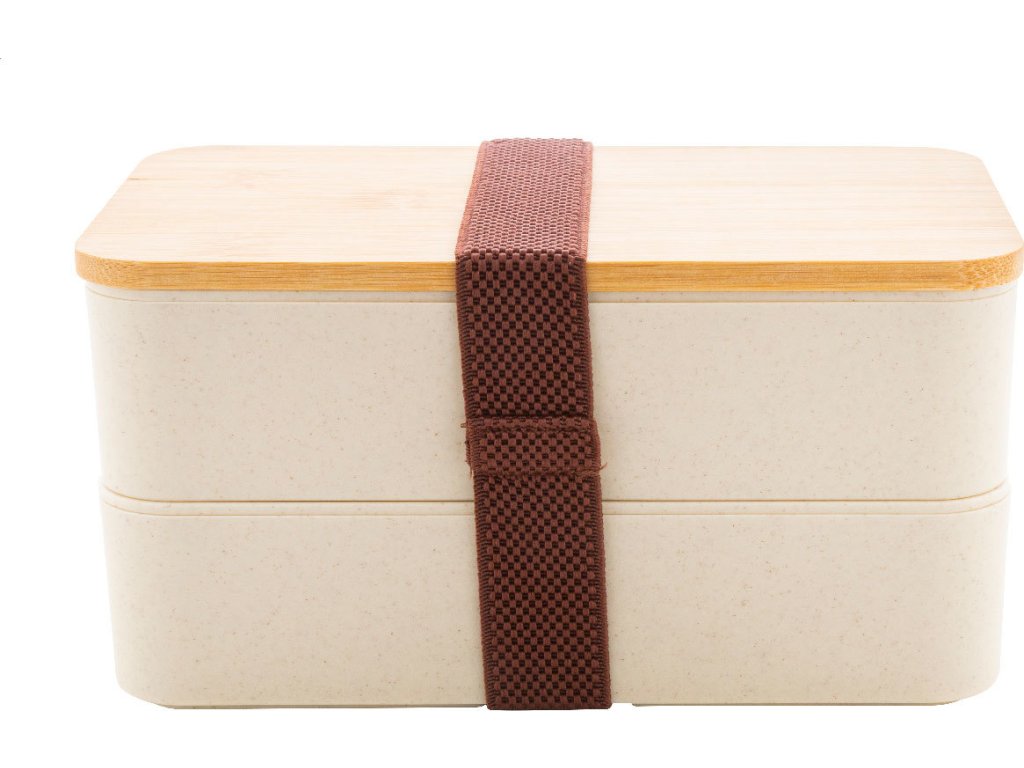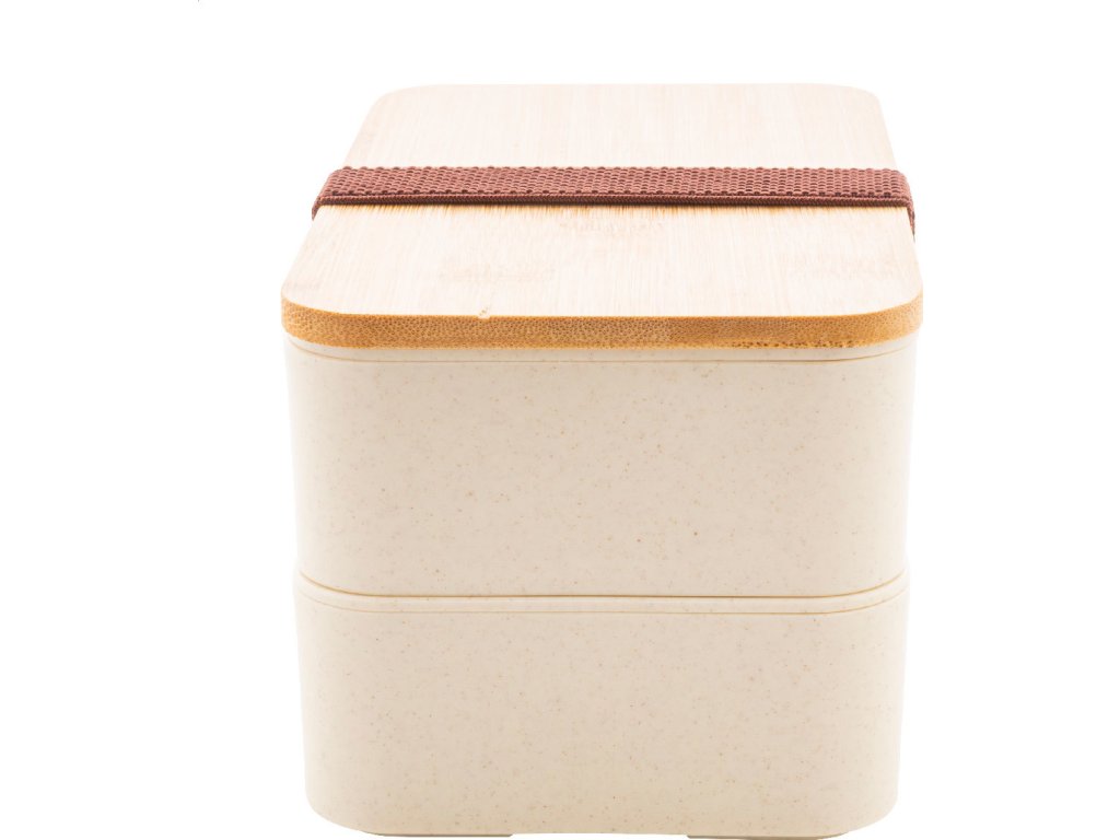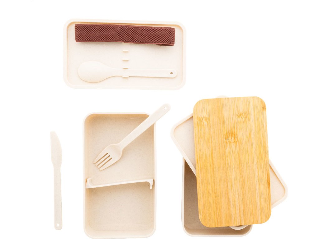 Box na jídlo z PP plastu se sadou příborů (vidlička, lžíce a nůž), bambusovým víkem a elastickým popruhem. Se 2 přihrádkami o objemu 700 ml.