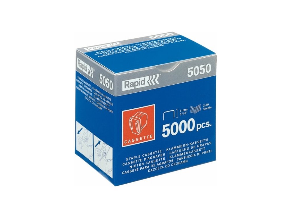 Kazeta se sponami pro elektrickou sešívačku Rapid 5050. Kapacita prošití až 50 listů 80g kancelářského papíru. Kazeta obsahuje 5000 spon. Délka horní strany spony 16,4 mm, délka trnu spony 8,1 mm, tloušťka drátku 0,62 mm.