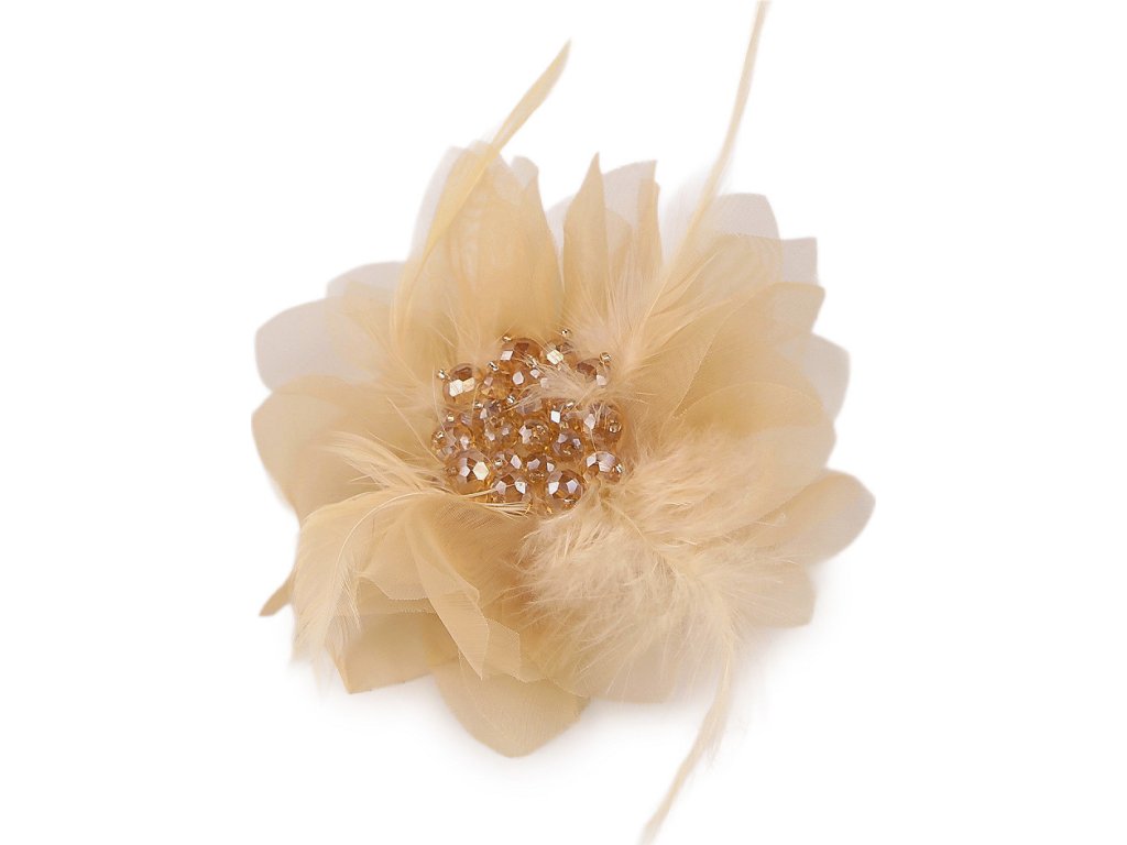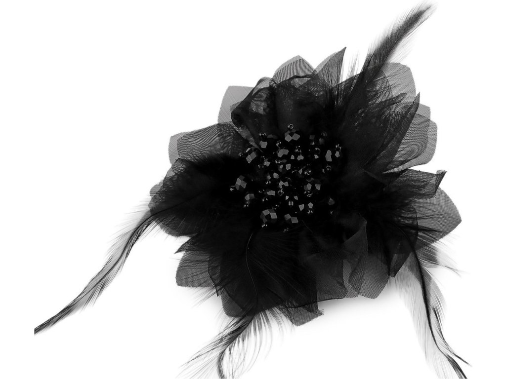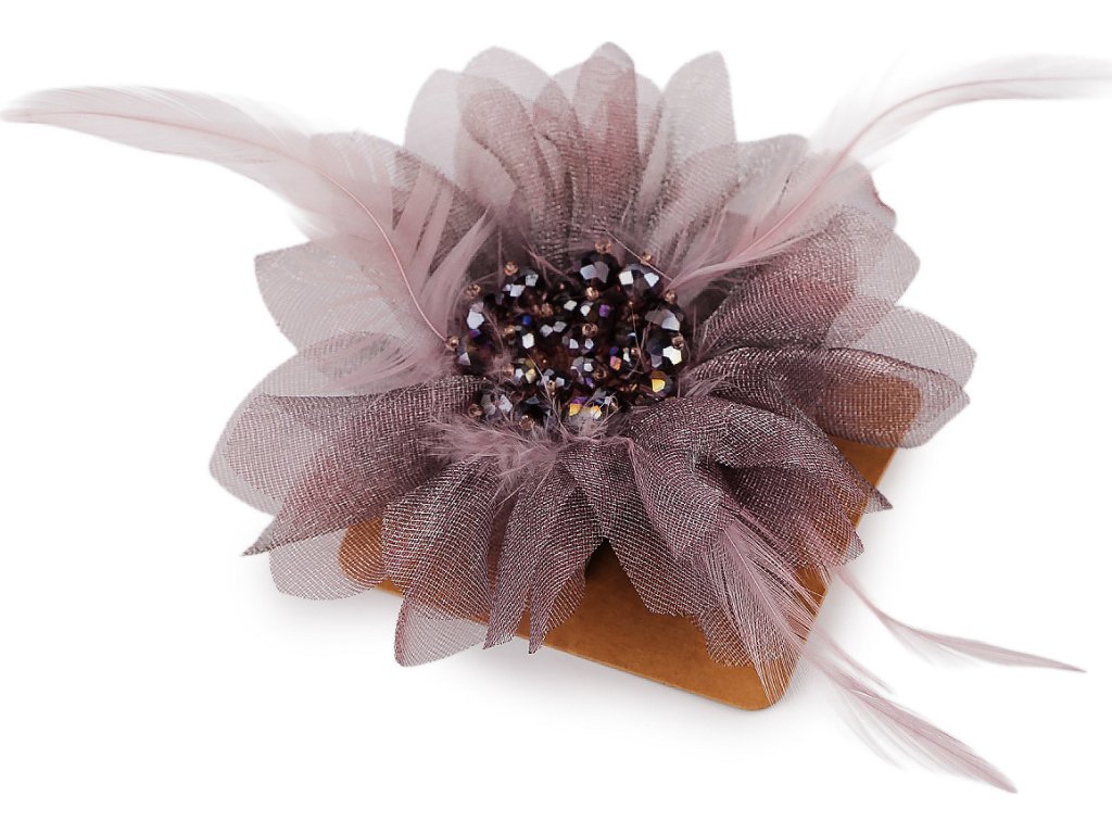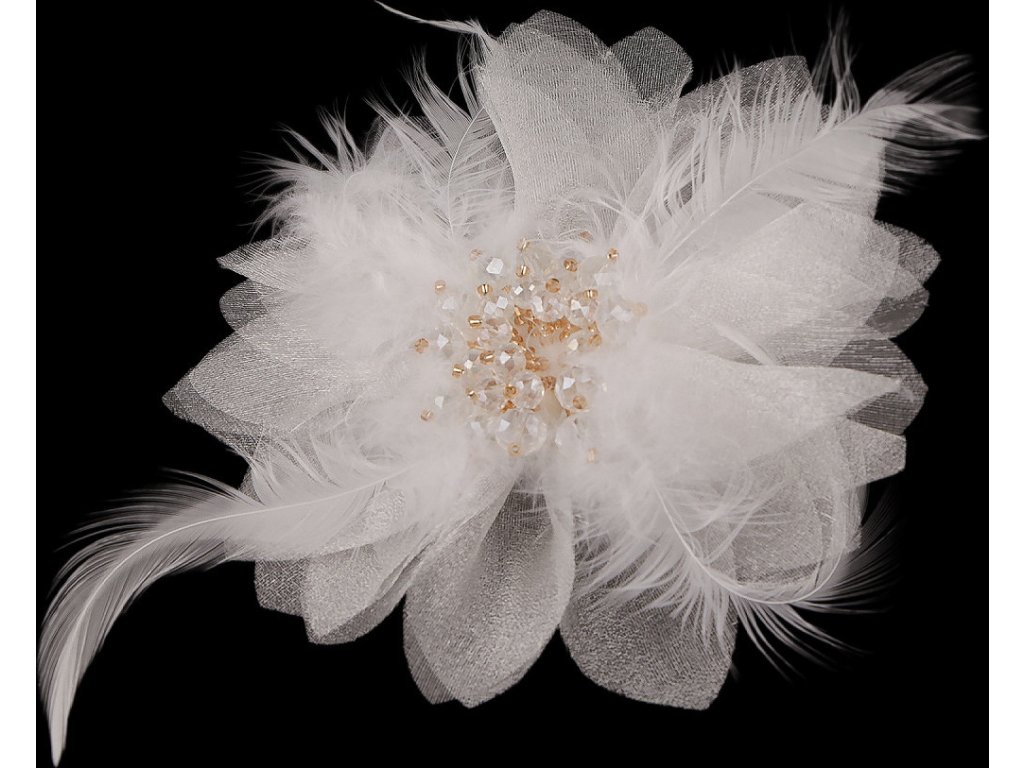Velká elegantní brož je vyrobená z jemného šifonu, který připomíná květinu, a její střed je zdobený peřím a třpytivými broušenými korálky, které jí dodávají luxusní vzhled. Ve spodní části má spínací špendlík a klips, takže ji můžete připevnit jak na oděv, tak do vlasů. Broží můžete ozdobit šaty, halenku, sako, kabát, klobouk i kabelku. Ve vlasech bude působit romanticky.