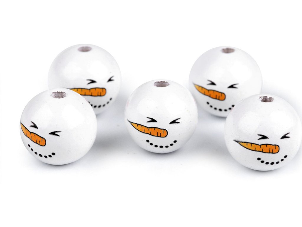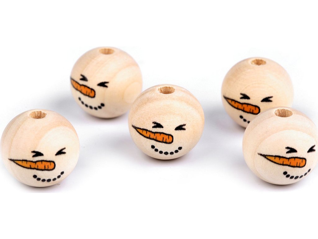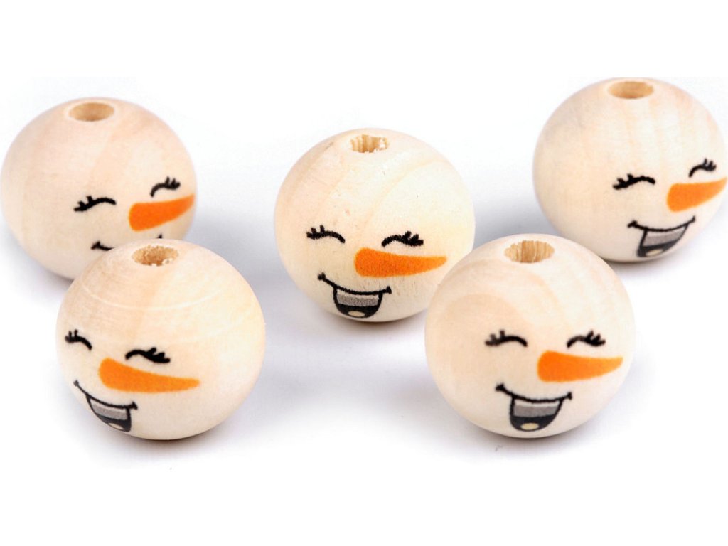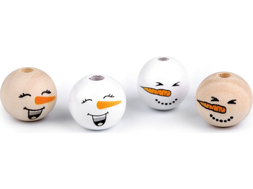 Dřevěné korálky s malovaným obličejem sněhuláka. S jejich pomocí si můžete vytvořit postavičky, vytvořit veselý náhrdelník, vyrobit prstové maňásky, veselé zápichy do květináče apod. Díky malbě se od sebe jednotlivé korálky mohou lišit. Může se lišit i kresba dřeva, včetně barvy. Vzhledem k technologii zpracování dřeva mohou být okolo průvleků otřepky. Obličej je na přední straně korálku, zadní strana je bez malby. Korálky č.1 a 3 se díky laku jemně lesknou, korálky č.2 a 4 jsou přírodní.