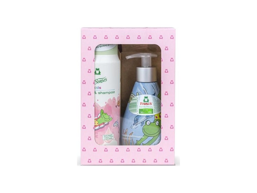 Dětská souprava obsahuje sprchový gel a šampon 2v1 a tekuté mýdlo v dávkovači s přidaným hydratačním panthenolem. Jemné složení kosmetiky Frosch na přírodní bázi má neutrální pH 5,5 a je vhodné pro citlivou dětskou pokožku. Výtažek z pšeničných proteinů obsažený v šamponu usnadňuje rozčesávání dětských vlasů a dodává jim lesk. Složení neobsahuje škodlivé chemické látky, jako jsou parabeny, ropné deriváty, mikroplasty nebo EDTA.