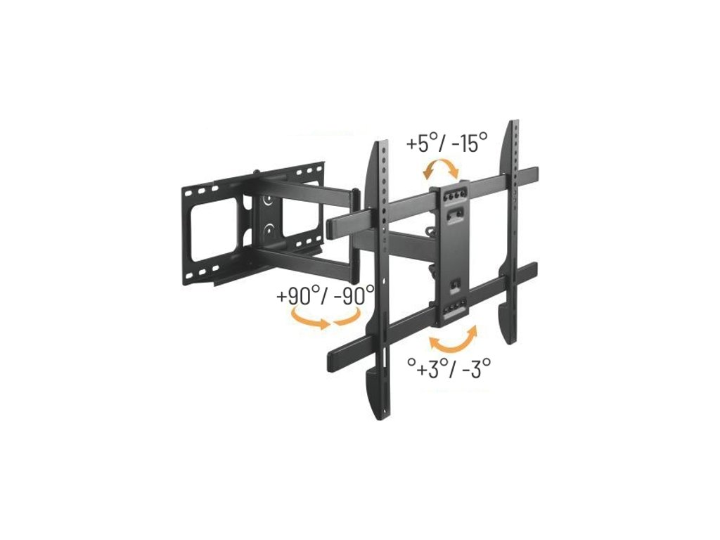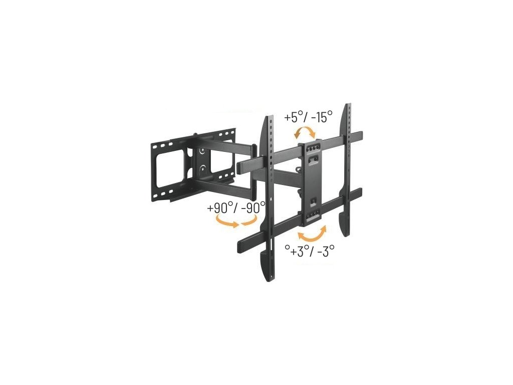 Nástěnný držák na plochou TV, výsuvné rameno s nastavitelnou vzdáleností od stěny, nastavitelný náklon, rotace a natočení do stran. Kompatibilní s různými modely o úhlopříčce od 32" až do 70", nosnost ramene až 45 kg. Svorka na vedení kabelů.