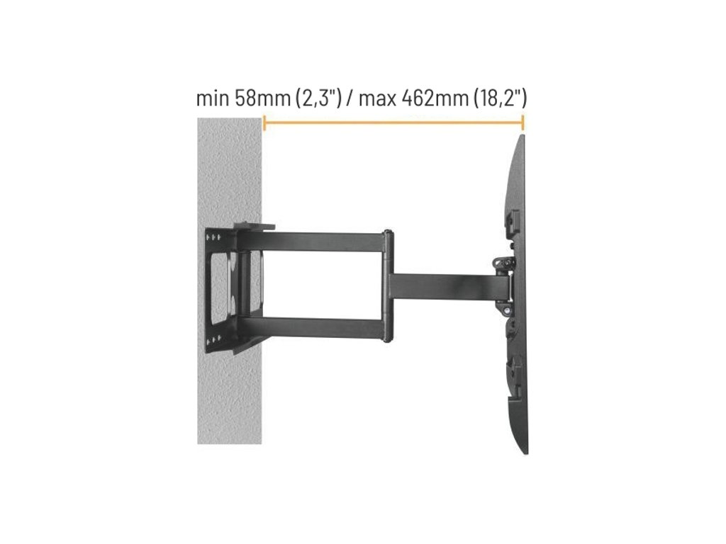 Držák je určený pro jeden plochý televizor s úhlopříčkou od 32" do 70". Odolné ocelové rameno unese hmotnost až 45 kg. Výsuvné rameno vám umožní nastavení vzdálenosti od 58 do 462 mm, naklopení nahoru a dolů, rotaci nebo natočení do stran. Obrazovku tak můžete sledovat z různých míst.