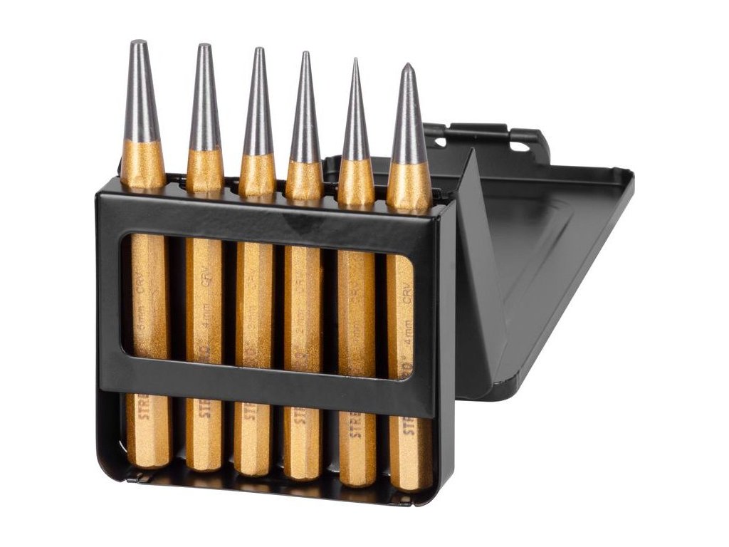 Sada průbojníků sestává ze 6 nástrojů o rozměrech: 5x jamkovač 1x120, 2x120, 3x120, 4x120 mm