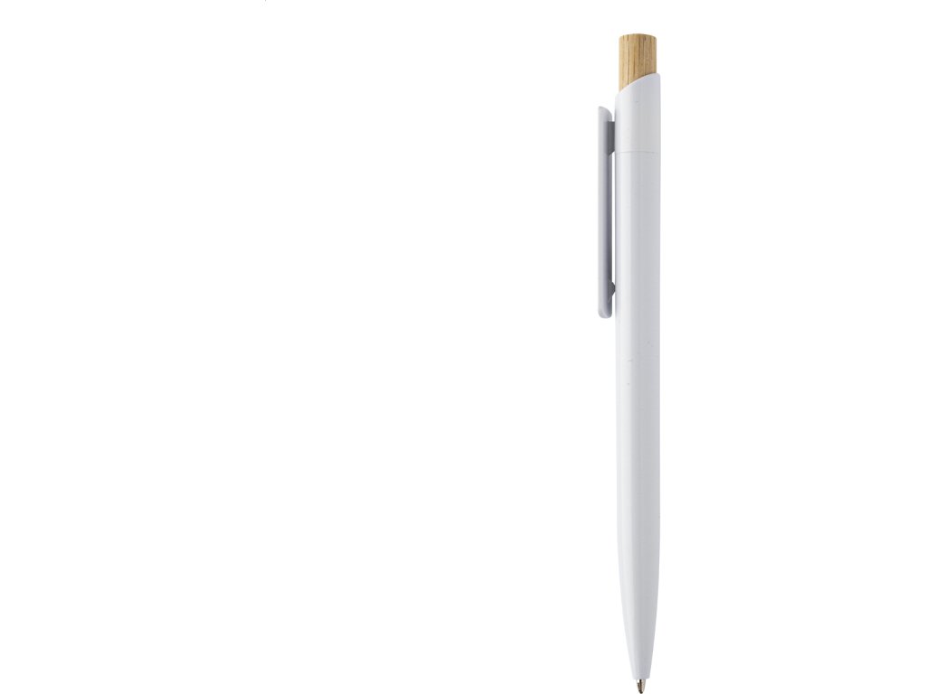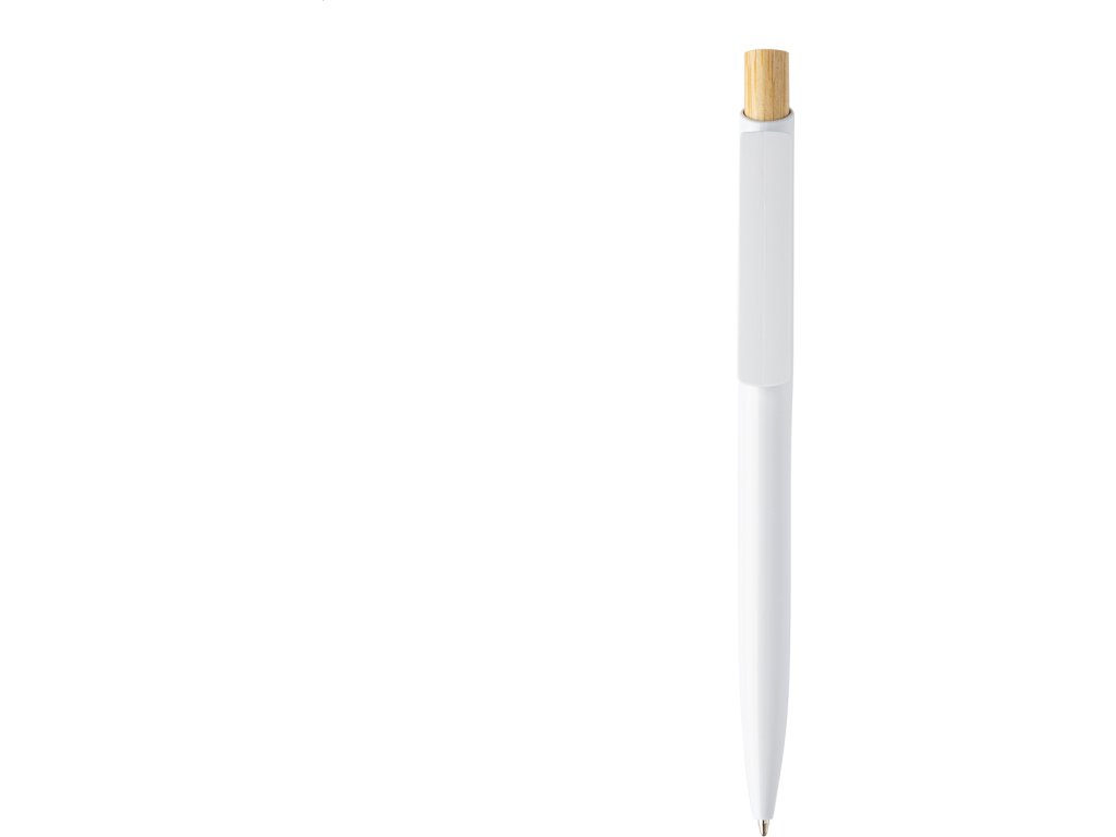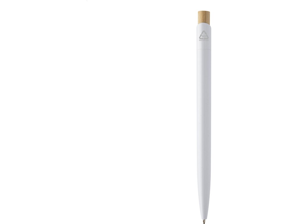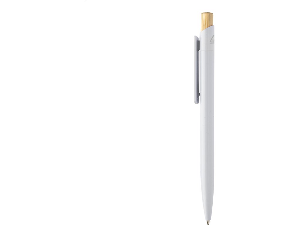 Kuličkové pero z recyklovaného ABS plastu s bambusovým tlačítkem. S modrou náplní.