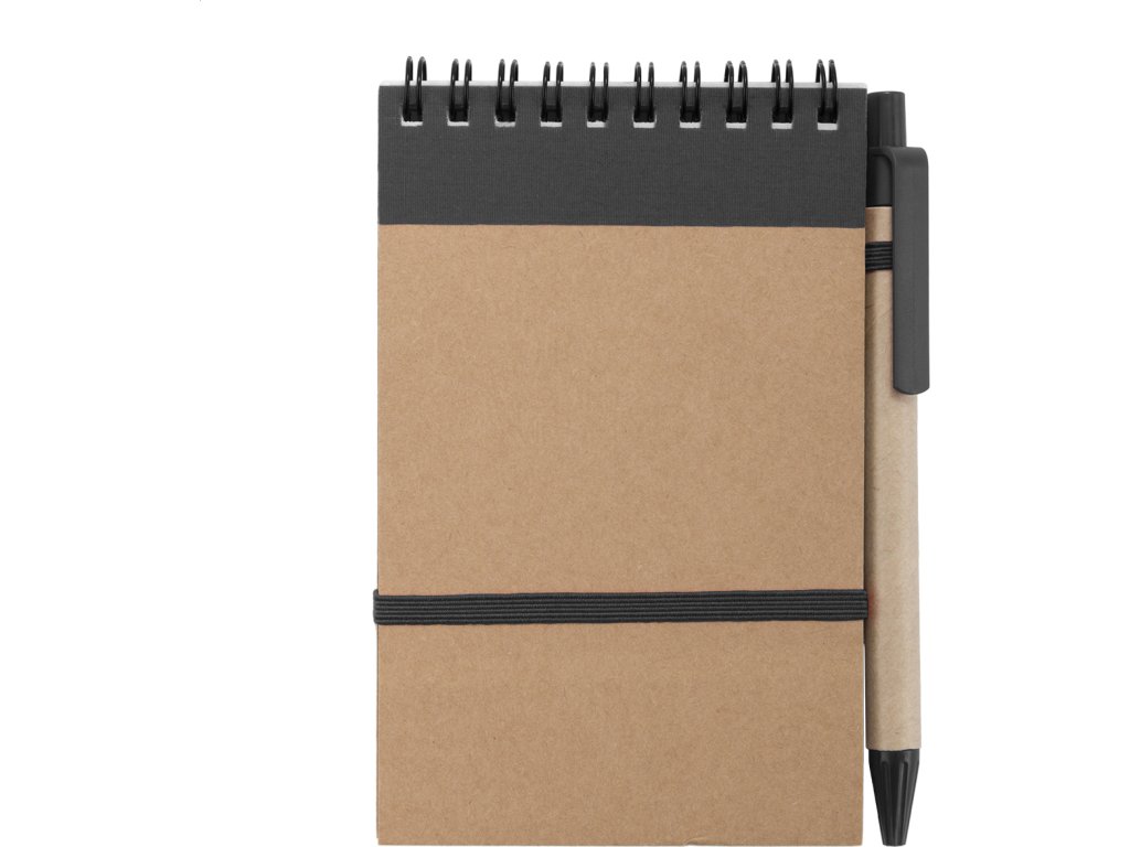Blok ve spirále z recyklovaného papíru se 70 linkovanými listy a kuličkovým perem z recyklovaného papíru s modrou náplní. Velikost A6.