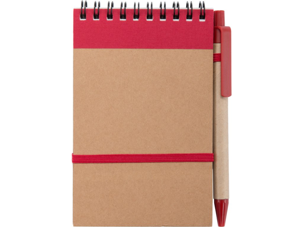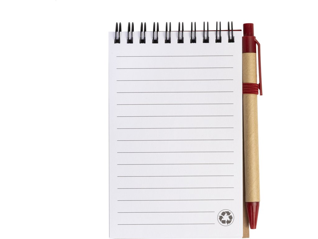 Blok ve spirále z recyklovaného papíru se 70 linkovanými listy a kuličkovým perem z recyklovaného papíru s modrou náplní. Velikost A6.