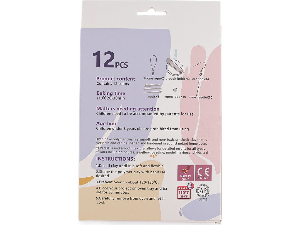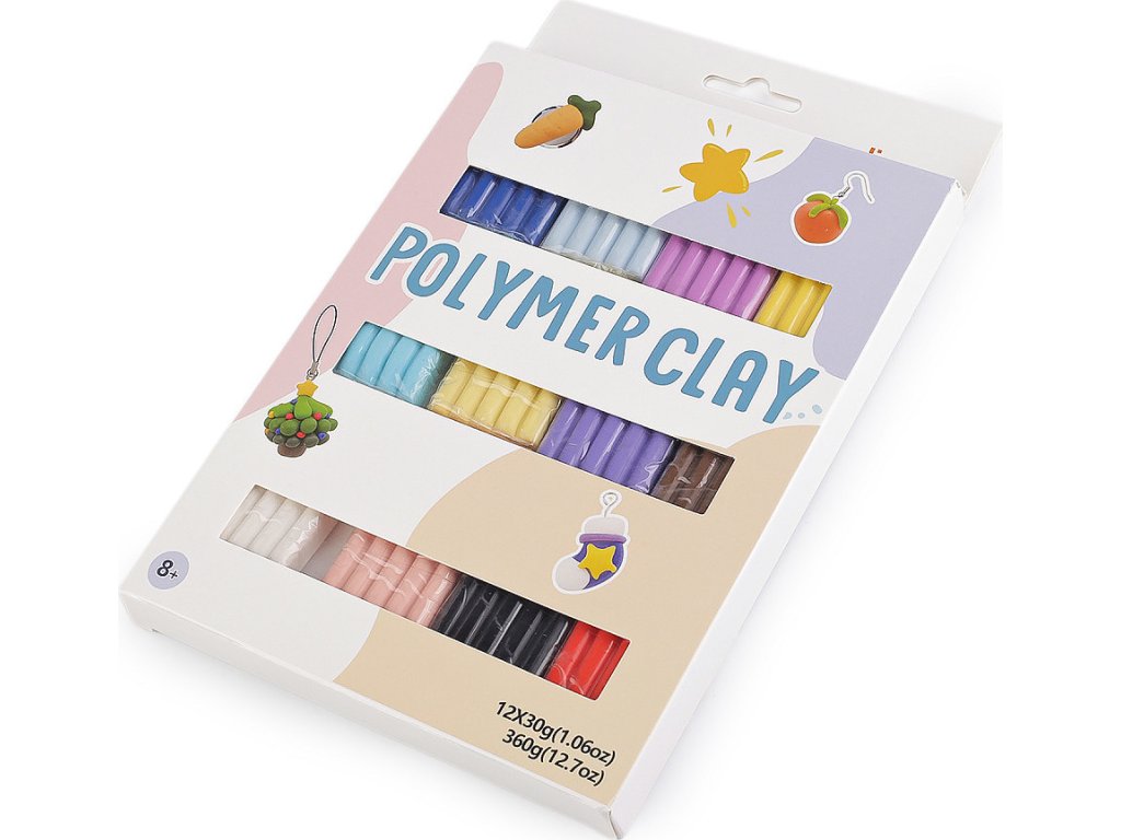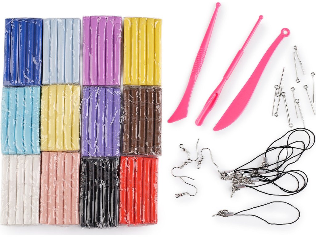 Sada modelovacích polymerových hmot obsahuje 12 ks různých barev. Uvnitř balení najdete i modelovací nářadí a bižuterní komponenty - afroháčky, poutka a ketlovací jehly. (Jednotlivé bižuterní komponenty se v baleních mohou lišit). Polymerová hmota se svou konzistencí podobá hmotě Fimo. Po prohnětení je dostatečně jemná, dá se lehce mísit (blendovat). Zároveň je dostatečně pevná, udrží jemné detaily při využití specializovaných technik. Hotové výrobky jsou velmi trvanlivé a odolné. Je ideální pro výrobu šperků, domácích dekorací a předmětů, které používáme každý den. Vymodelovaný výrobek se zapeče v elektrické troubě při 110 - 130°C po dobu 15 - 30 minut. Návod k použití: Hmotu prohnětejte a vytvarujte. Pro vypracování jsou vhodné např. modelovací špachtle. Vymodelovaný předmět na aluminiové fólii nebo na skleněné desce vložte do elektrické trouby, předehřáté na min. 110°C a nechte vytvrdit max. 30 min. Není určeno do mikrovlnné trouby! Skladování: Hmotu skladujte v aluminiové fólii nebo PE sáčcích při pokojové teplotě. Hmota nesmí přijít do styku s polystyrenem, PVC a pěnovým polystyrénem.
