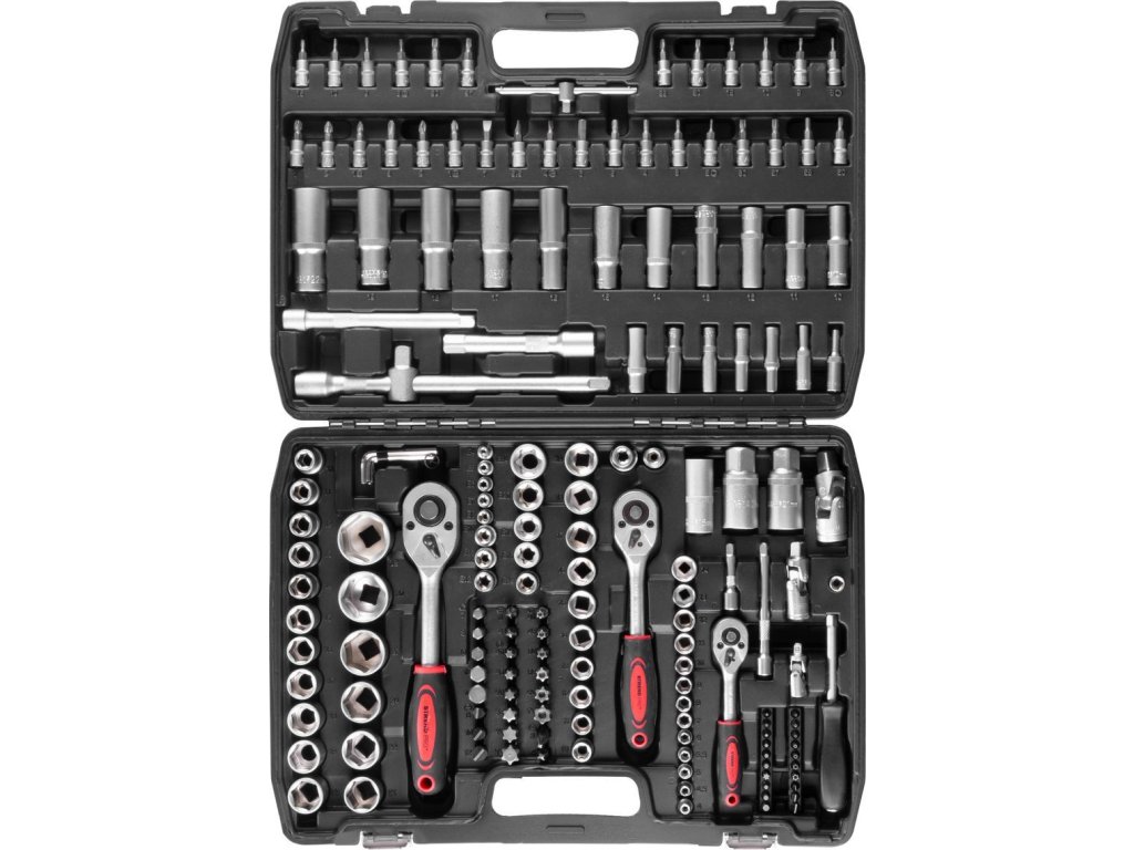 Táto komplexná sada náradia je vyrobená z vysokokvalitných materiálov (CrV) a poskytuje široké spektrum nástrojov na rôzne typy prác. Praktické usporiadanie v kufri umožňuje jednoduché prenášanie a prehľadné uloženie všetkých dielov.
