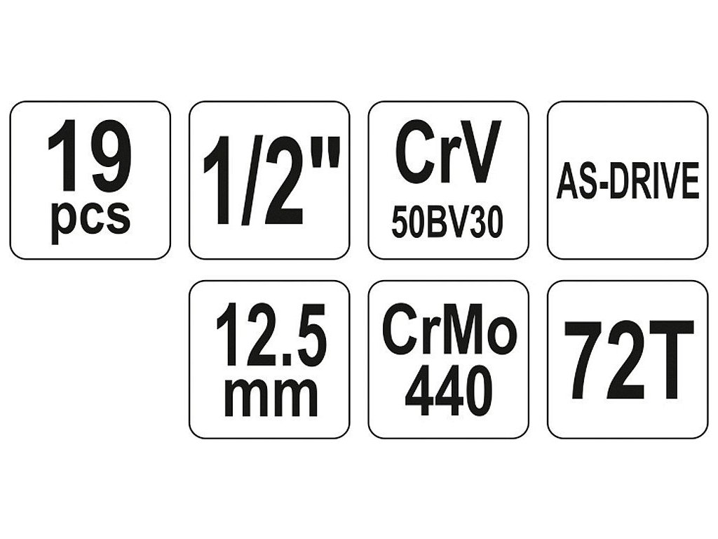 Gola sada 1/2" obsahuje 19ks: nástavce a ráčnu s plastovou rukojetí. Vyrobené z kvalitní chromvanadiové oceli CrV6140 a CrV50BV30, S2 s funkcí AS-DRIVE.
