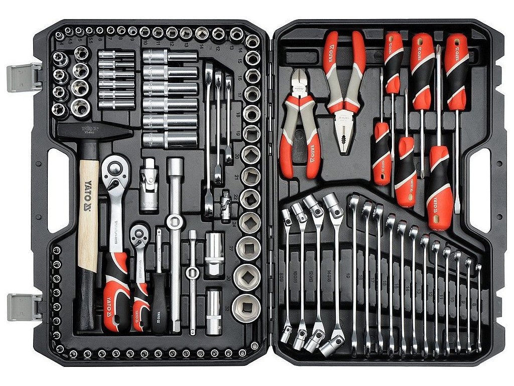 Gola sada 1/2", 3/8", 1/4" obsahuje 109ks: metrických nástavců, prodlužovacích nástavců, ráčny s plastovou rukojetí a 72 zubým jemným chodem, kloubové nástavce, očkoploché klíče, ráčnové klíče, trubkové klíče, kleště šroubováky, kladivo, nástavce s nejběžněji používanými bity a další příslušenství. Vyrobené z kvalitní chromvanadiové oceli CrMo440, CrV6140, CrV6150 a CrV50BV30, S2 s funkcí AS-DRIVE.